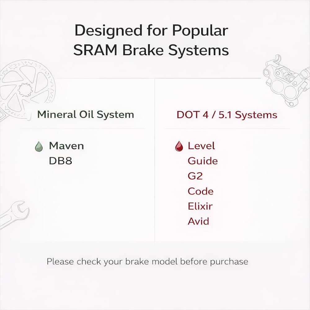 توافق النظام المزدوج: يعمل مع فرامل الزيوت المعدنية SRAM Maven وDB8 بالإضافة إلى فرامل قرصية هيدروليكية SRAM/Avid DOT 4/5.1، تغطي النماذج الشائعة مثل Level وGuide وG2 وCode وElixir.