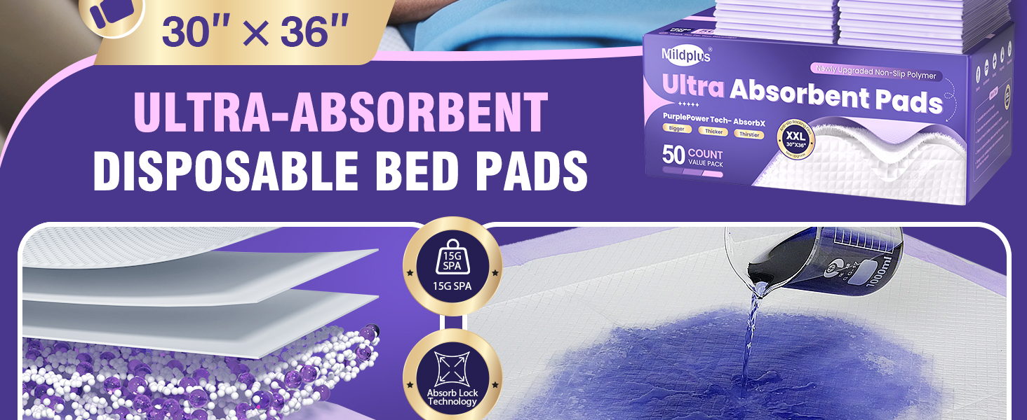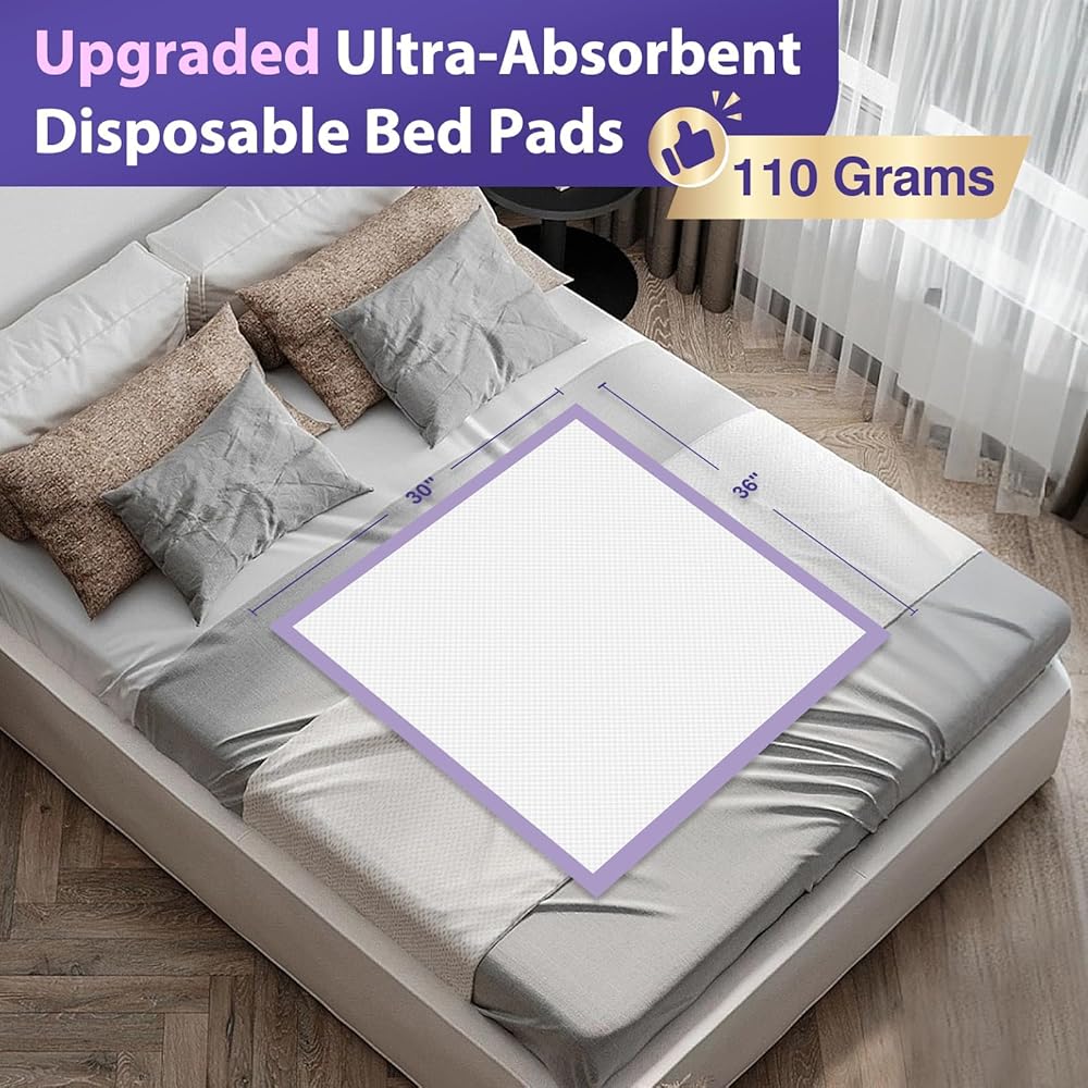 وسادات سرير شديدة التحمل 110 جرامًا مقاس 76.2 سم × 91.44 سم، 50 قطعة من وسادات ميلدبلوس الأرجوانية للاستعمال مرة واحدة مع طبقة مضادة للانزلاق، وسادات ظرف كبيرة جدًا، وسادات سلس البول أكثر سمكًا 3 مرات للبالغين والأطفال أو الحيوانات الأليفة