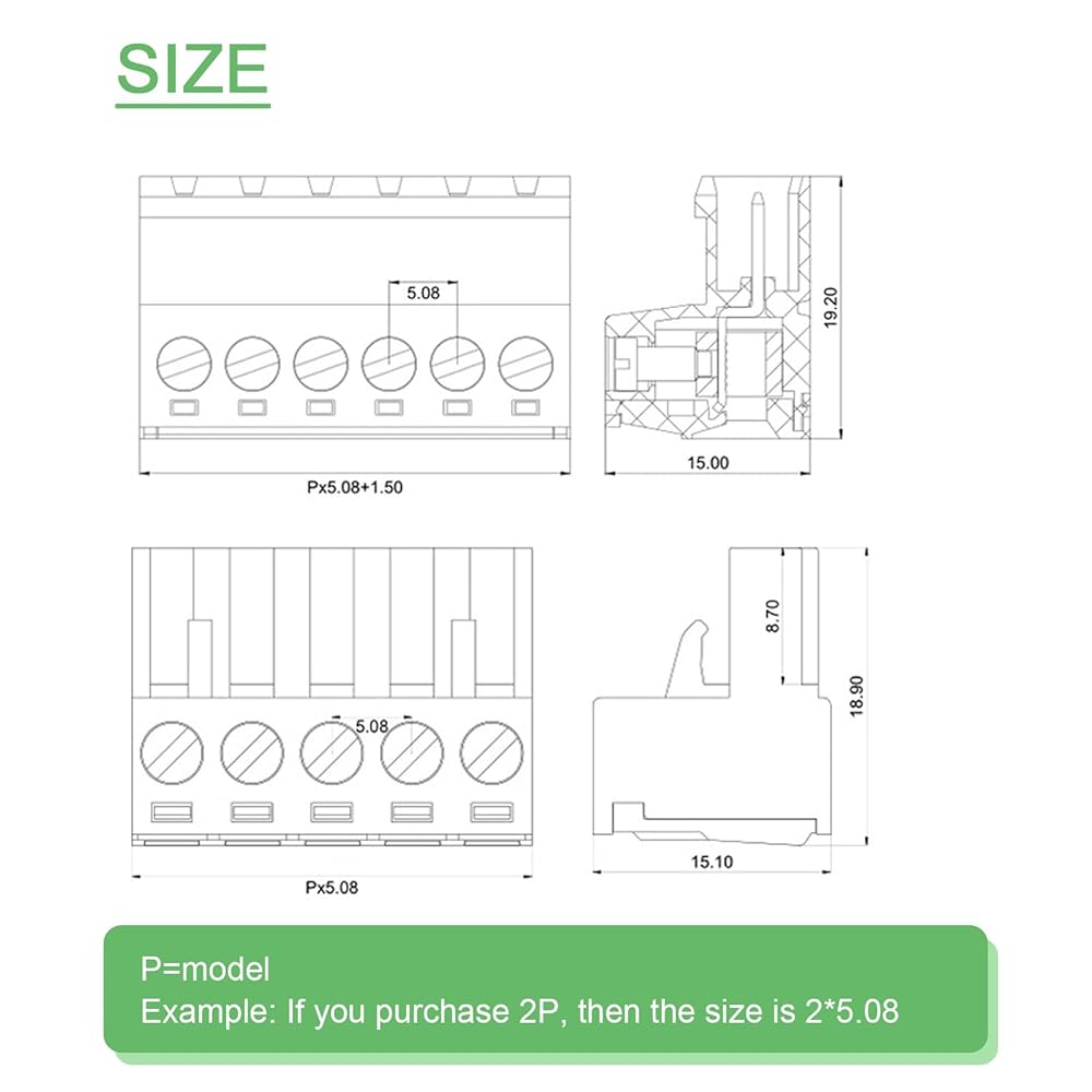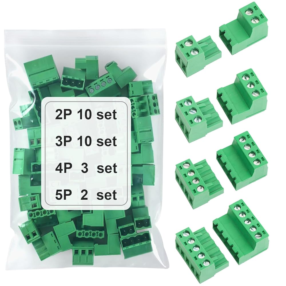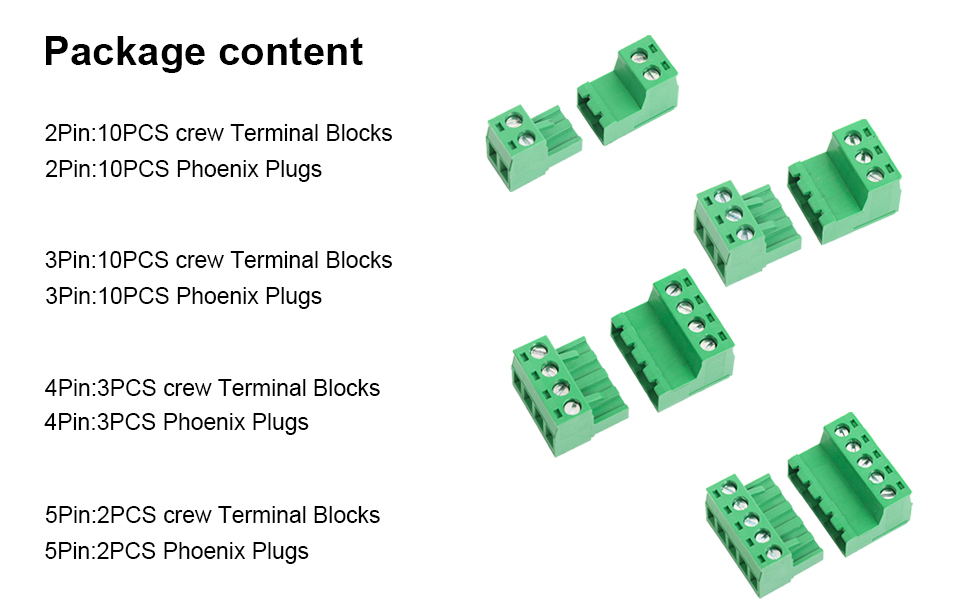 تتضمن الحزمة: 25Set 5.08 مللي متر الملعب المسمار محطة كتلة موصل (2Pin 10 مجموعة ، 3Pin 10 مجموعة ، 4Pin 3 مجموعة ، 5Pin 2 مجموعة).