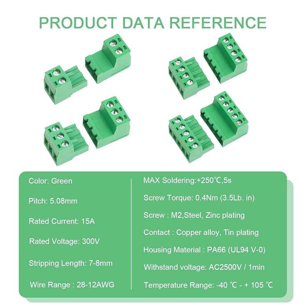 المواد: مادة الغلاف (PA66 UL94V-0)؛ مادة التلامس (سبائك النحاس، المعلبة) ; مادة المسمار (M2، الصلب، المجلفن) ; القيمة المقدرة: AC 300V، 15A.