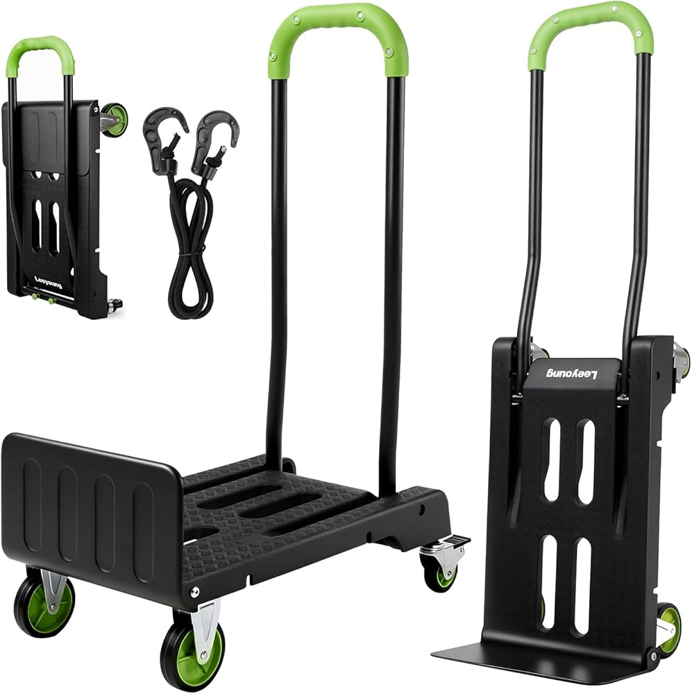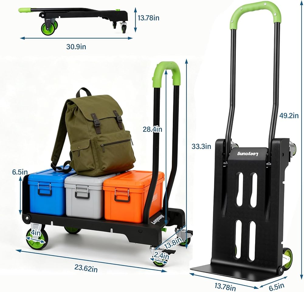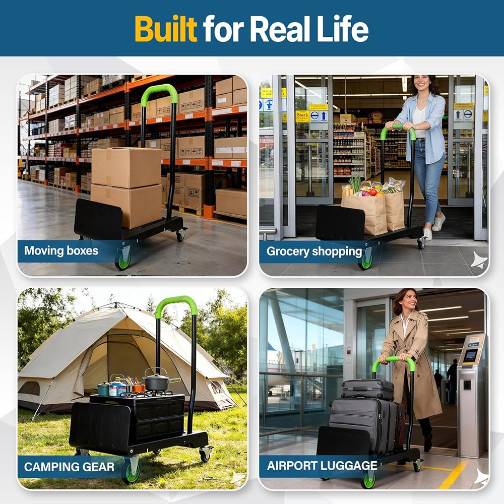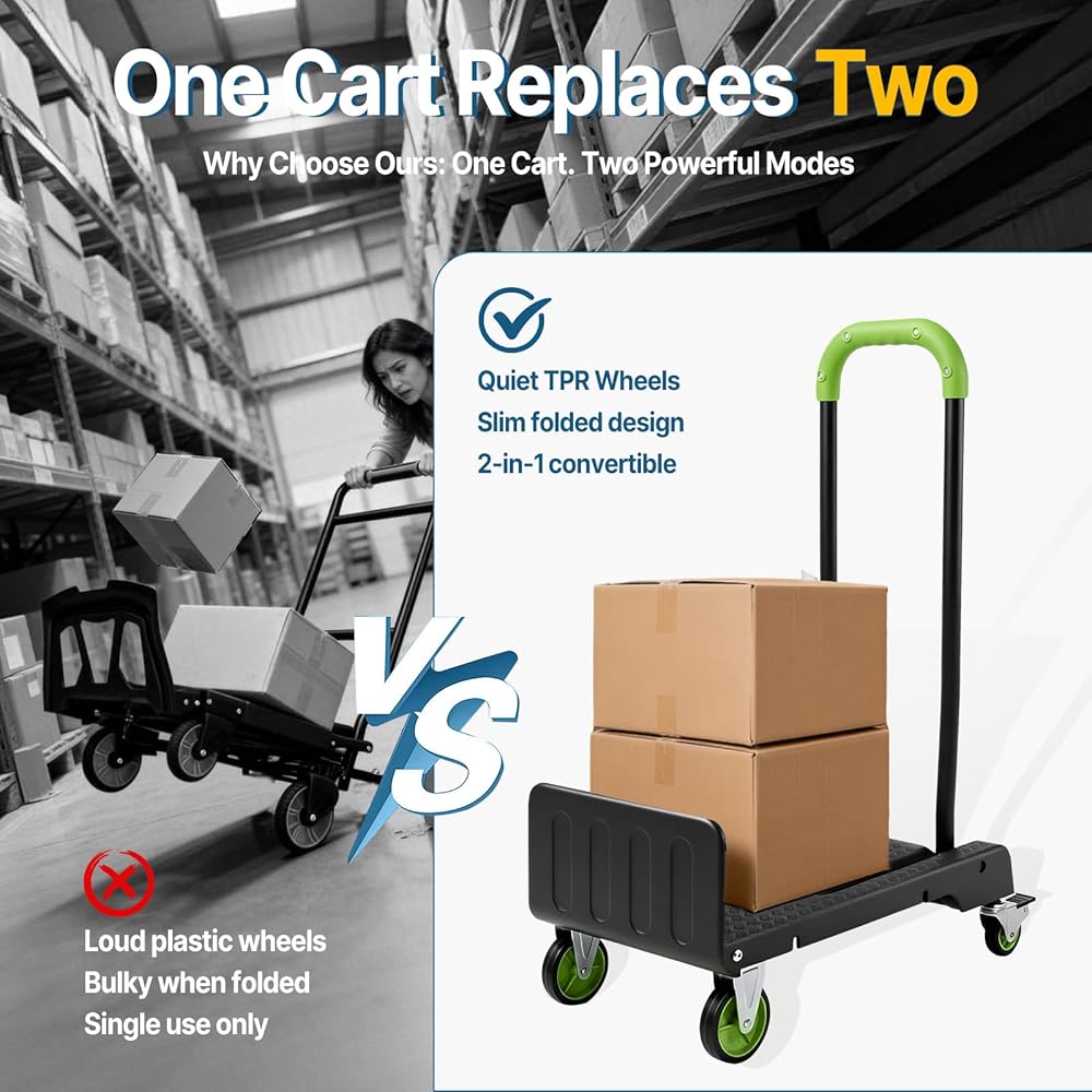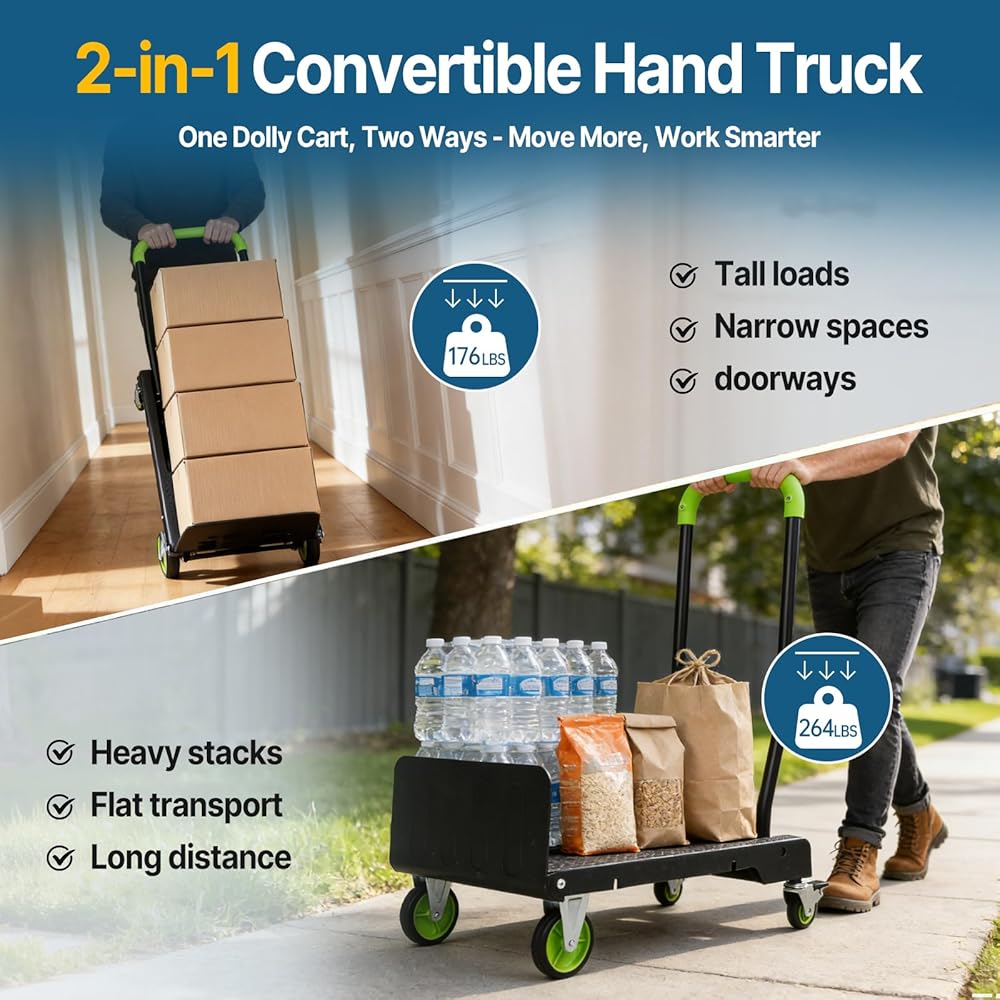 • 1.2-in-1 Folding Hand Truck & Dolly — One Cart Replaces Two: This convertible hand truck easily switches between a 2-wheel upright hand truck and a 4-wheel flat platform cart, helping you move tall boxes or heavy stacked items with one compact folding dolly cart.