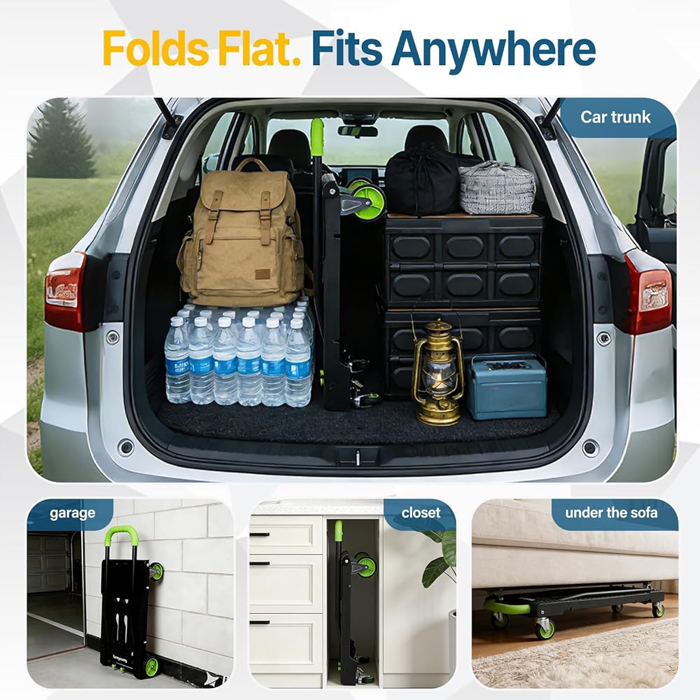 • 5.Lightweight, Compact Folding Cart for Easy Storage: Weighing only 12.5 lb, this compact folding hand truck folds flat to fit car trunks, closets, or garage corners — a space-saving hand truck dolly for everyday use.