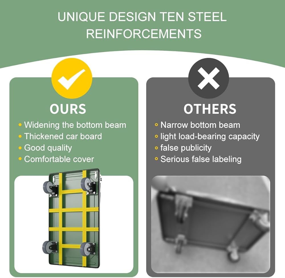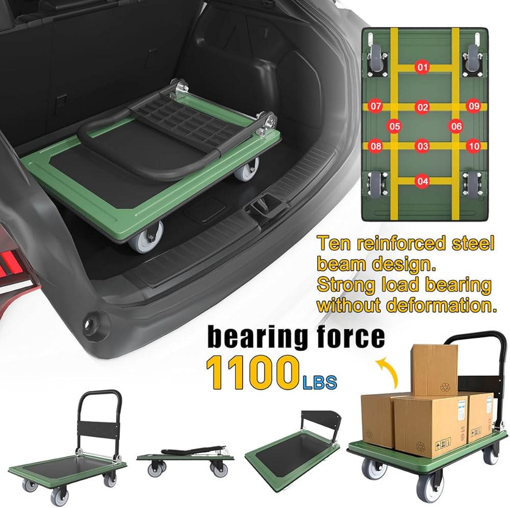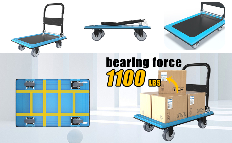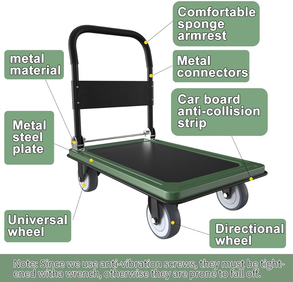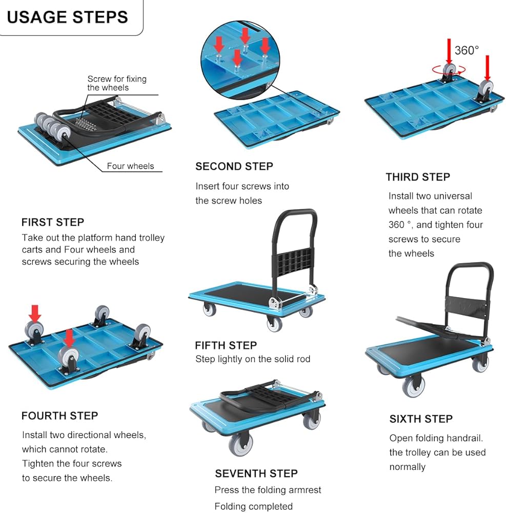 سهلة الطي للتخزين، الأبعاد المطوية هي 35.4 بوصة طول × 23.6 بوصة عرض × 10.6 بوصة ارتفاع ويمكن وضعها في أي زاوية. تساعد اللوحة المضادة للانزلاق على منع البضائع من الانزلاق خارج العربة
