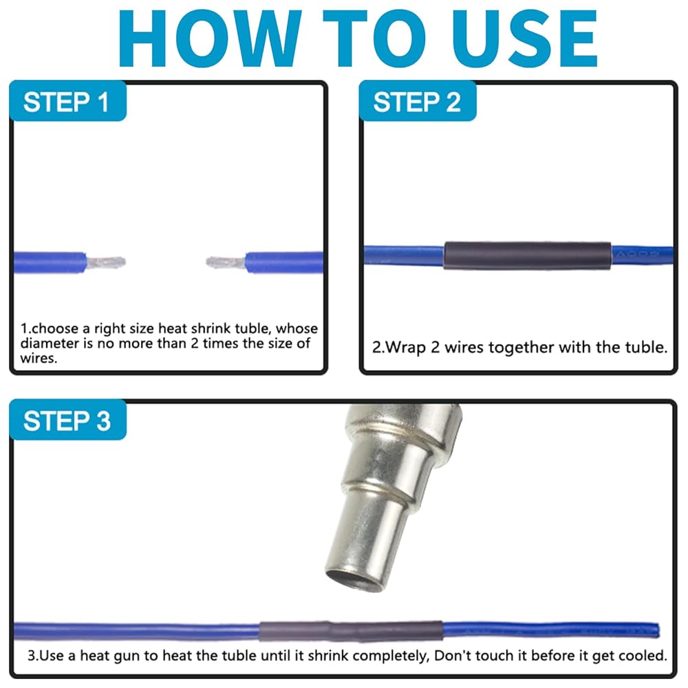 سهل الاستخدام - 1، اختر الحجم المناسب للأنابيب، وأدخل الأسلاك في الأنبوب، ثم ضعها في مكانها بعد إجراء الاتصال. 2، احتفظ بالفوهة على مسافة 2 بوصة تقريبًا من الأنبوب، ثم ضع الحرارة بزاوية 45 درجة حتى ينكمش الأنبوب بإحكام حول المفصل.