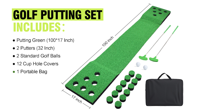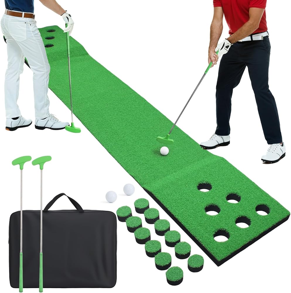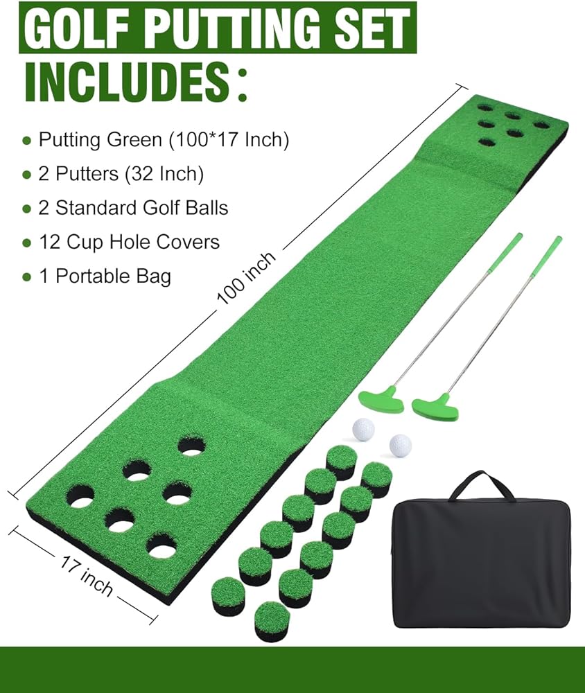مجموعة ألعاب وضع الجولف للاستخدام الداخلي والخارجي، بساط أخضر محمول لوضع كرة الجولف مع مضربين وكرتين وغطاء 12 فتحة وحقيبة تخزين للمنزل والفناء الخلفي والمكتب والحفلات