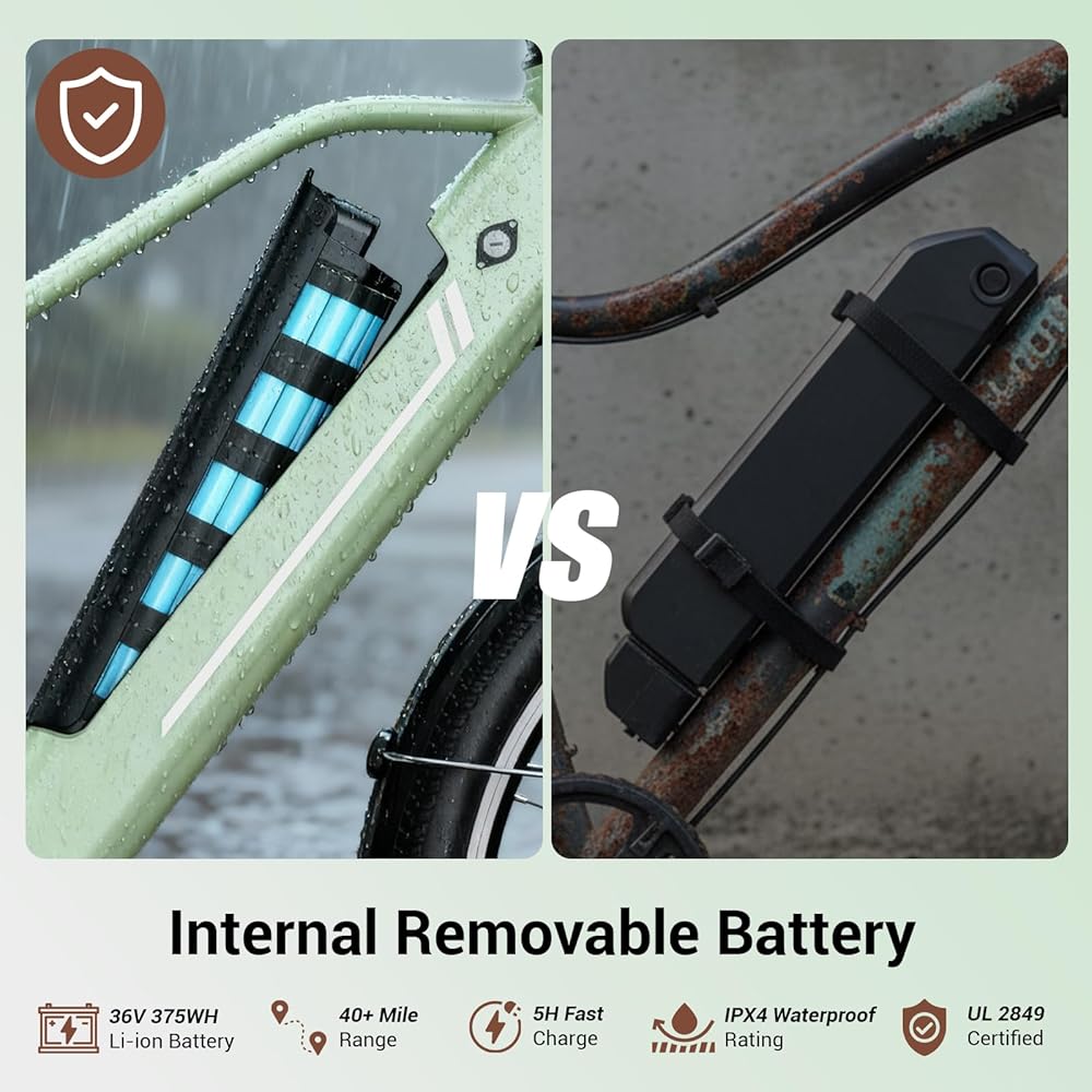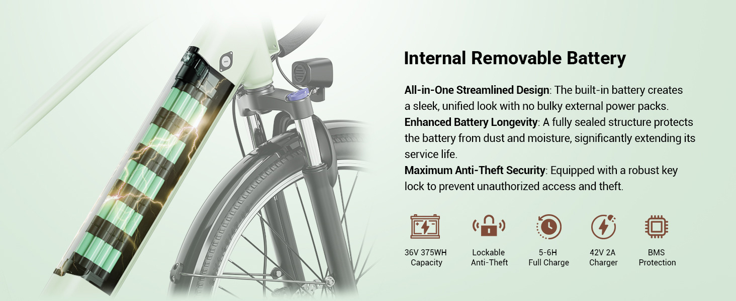 【بطارية قابلة للإزالة 36 فولت】تعمل هذه الدراجة الإلكترونية ببطارية ليثيوم أيون ذات سعة كبيرة، وتوفر نطاقًا يصل إلى 40 ميلًا في وضع المساعدة (* قد يختلف النطاق حسب وزن الراكب والتضاريس ومستوى المساعدة). يمكن إزالة البطارية بسهولة للشحن الداخلي الآمن خلال 5 إلى 6 ساعات فقط، مما يلغي الحاجة إلى منفذ خارجي - مما يجعلها الخيار الأمثل لسكان الشقق والركاب وأي شخص يقدر الأمان والشحن السهل.