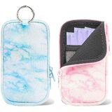 Our 2-pack pink and blue marble period storage set comes with two different marble patterns. Made of waterproof chloroprene rubber, it works as a multi-functional period bag, tampon holder and pad pouch, protecting your feminine essentials from water and spills. Each pouch has a sturdy round buckle for easy clipping to backpacks. With dual compartments and a mesh pocket, it's compact, discreet (looks like a makeup pouch), and versatile—also stores small meds, earbuds or jewelry. Durable, easy to clean, it's perfect for women for daily use or travel, a practical and stylish gift.
