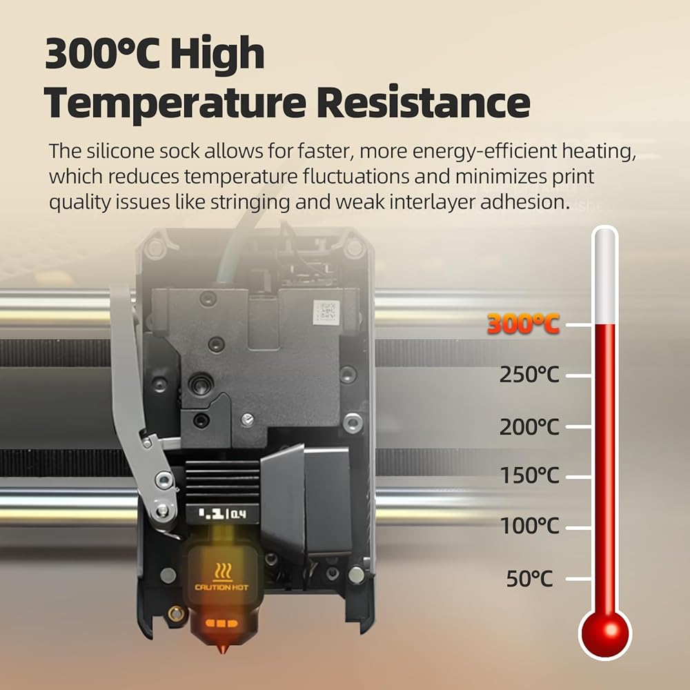 【Maintain Stable Temperature】The P2S silicone sock minimizes heat loss, keeping the heating block and nozzle at a consistent temperature. This ensures accurate sensor readings and improves print quality.