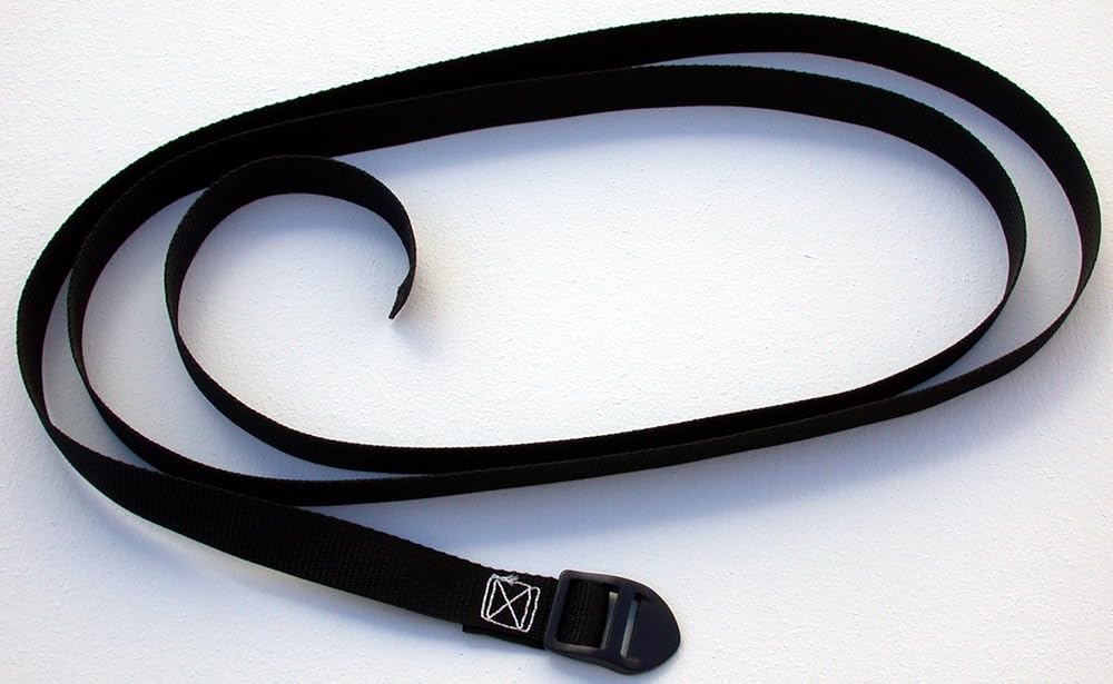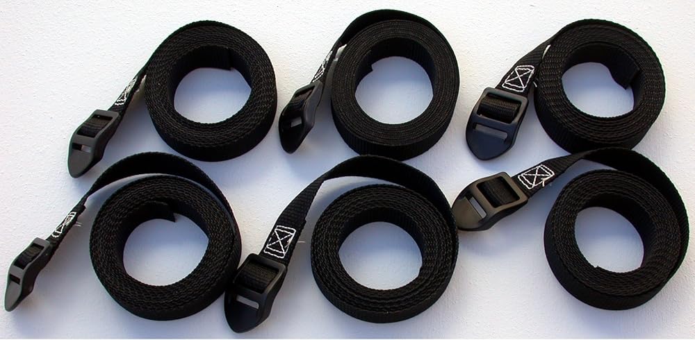 Set of six black one-inch wide polypropylene web straps, approximate 8-ft long with super heavy duty ladder lock plastic tension buckle. Has approximate usable distance of 44-inch. Great for applying additional tension to volleyball net netting and dowel rod. Quickly loop around net sides with dowel rod and pole, eliminating the hassle with rope tie cords and knots. Can also be used as light-duty tie-down strap for other applications.