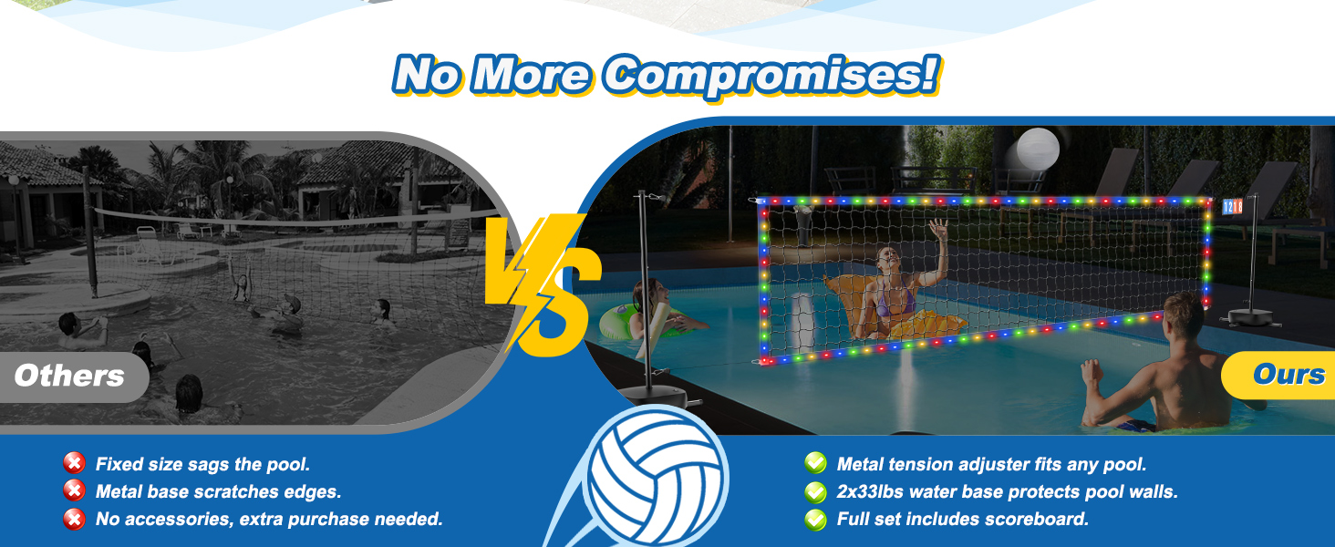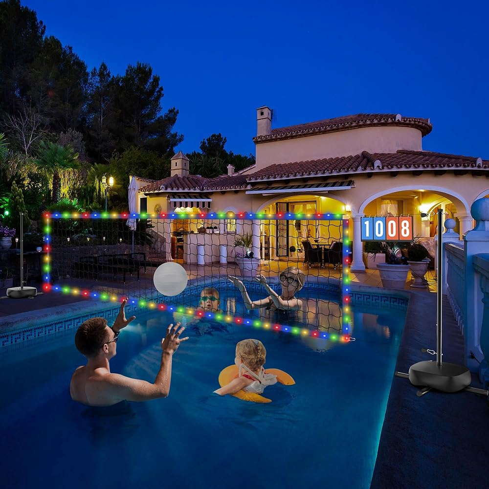 【All-Inclusive Multi-Sport Kit】Comes with scoreboard, 2 volleyball balls, LED strip, pump, storage bag, and rust-proof poles. Use this pool volleyball set for tennis, badminton, or indoor/outdoor pools—adapts instantly to any game.