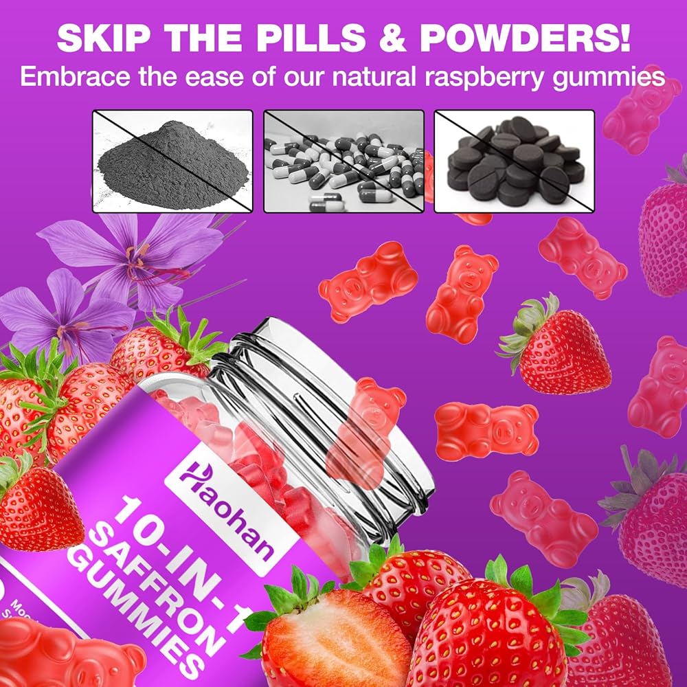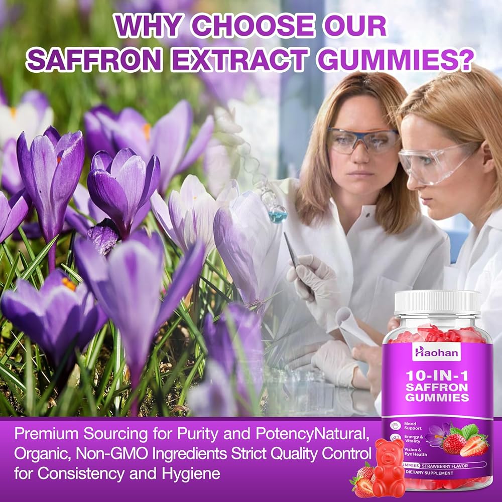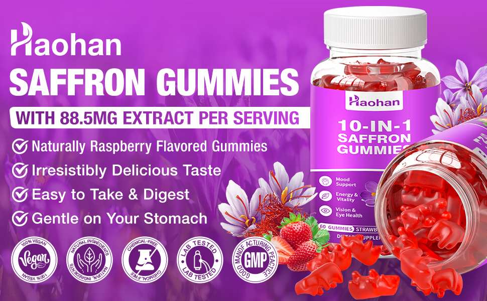 حلوى هاوهان سافرون للأطفال والكبار - مكمل 10 في 1 مع 88.5 ملجم من مستخلص الزعفران العضوي لدعم هدوء العقل والتركيز. خالي من السكر، غير معدل وراثيًا، نكهة الفراولة، 120 قطعة