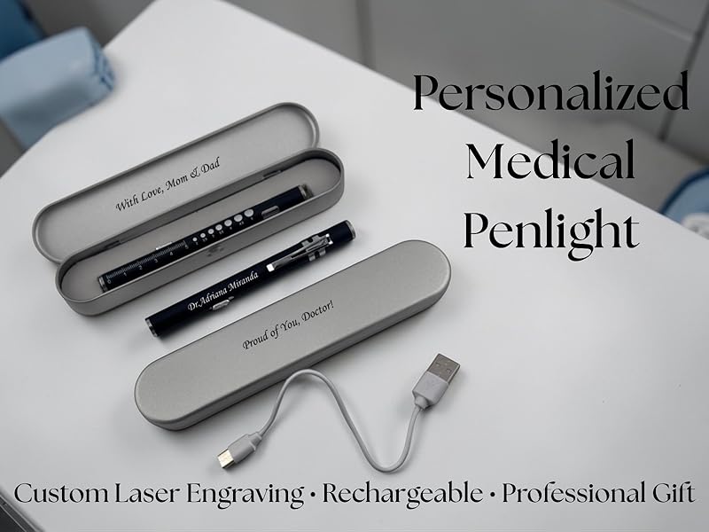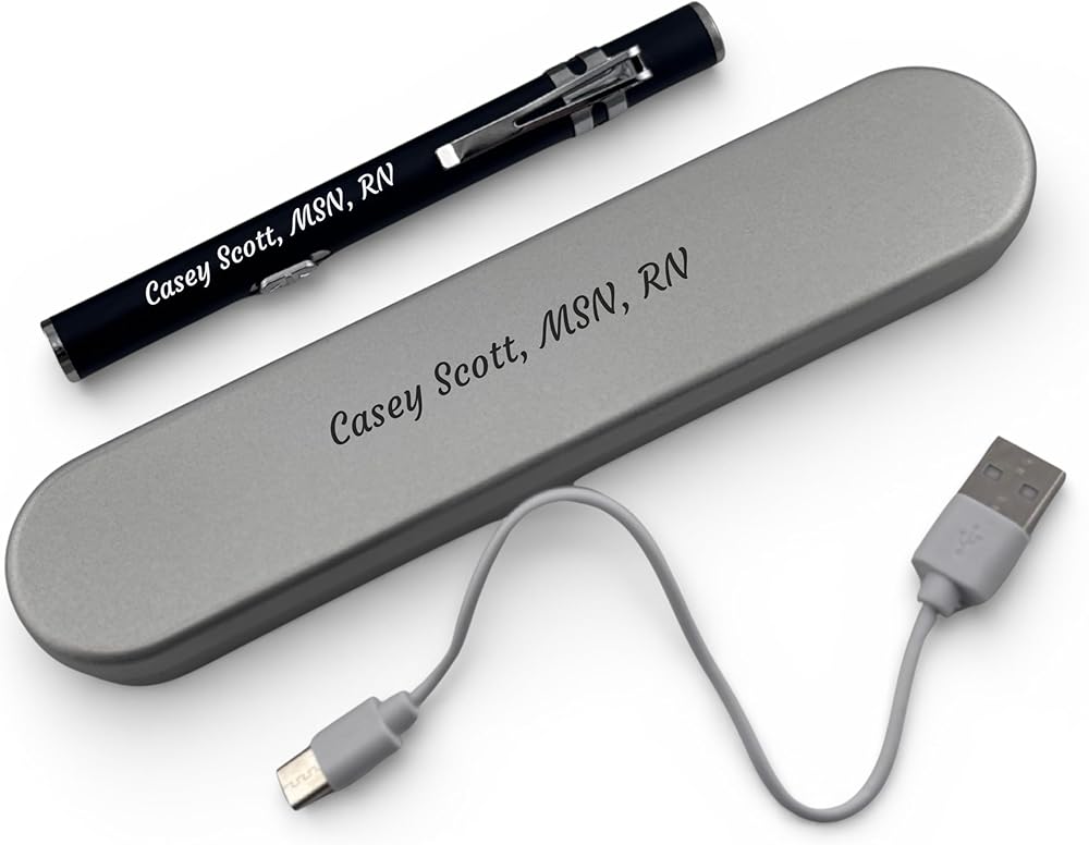 قلم طبي شخصي مع نقش بالليزر قلم طبي منقوش مخصص للممرضات والأطباء وأطباء الطوارئ وطلاب الطب. لن يبهت النقش بالليزر الدقيق الدائم أو يتقشر أو يُحتك - مما يخلق أداة تشخيصية احترافية وشخصية طويلة الأمد.