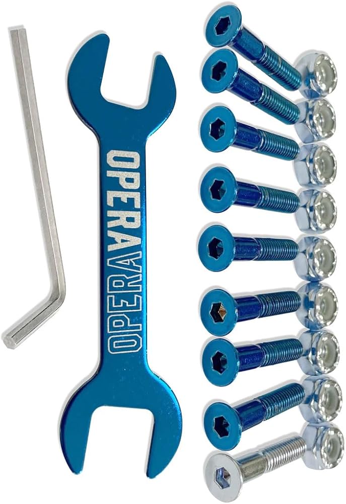 - 7/8" hardware. 8 anodized blue / 1 silver bolt with all silver nuts. Hardware and wheel wrench. Allen tool.