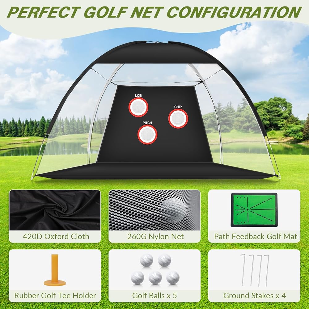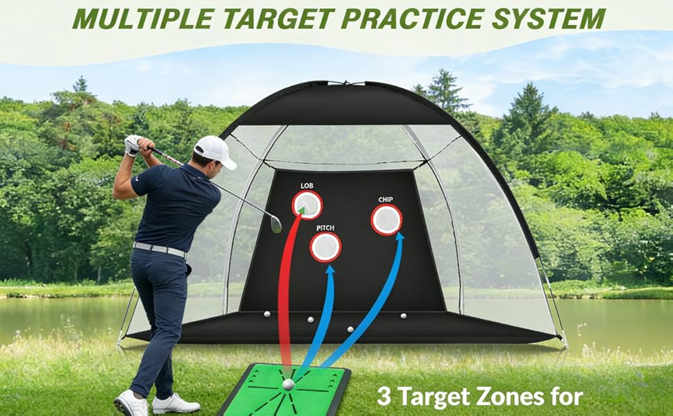 مجموعة تدريب الجولف مقاس 10 × 7 أقدام: مع 3 جيوب مستهدفة (لمهارات LOB وPITCH وCHIP). تساعد السجادة على تحسين تقنية التأرجح، بينما تعمل الشبكة المستهدفة على تعزيز الدقة - وهي مناسبة للمبتدئين واللاعبين ذوي الخبرة لإتقان جميع مهارات الجولف.