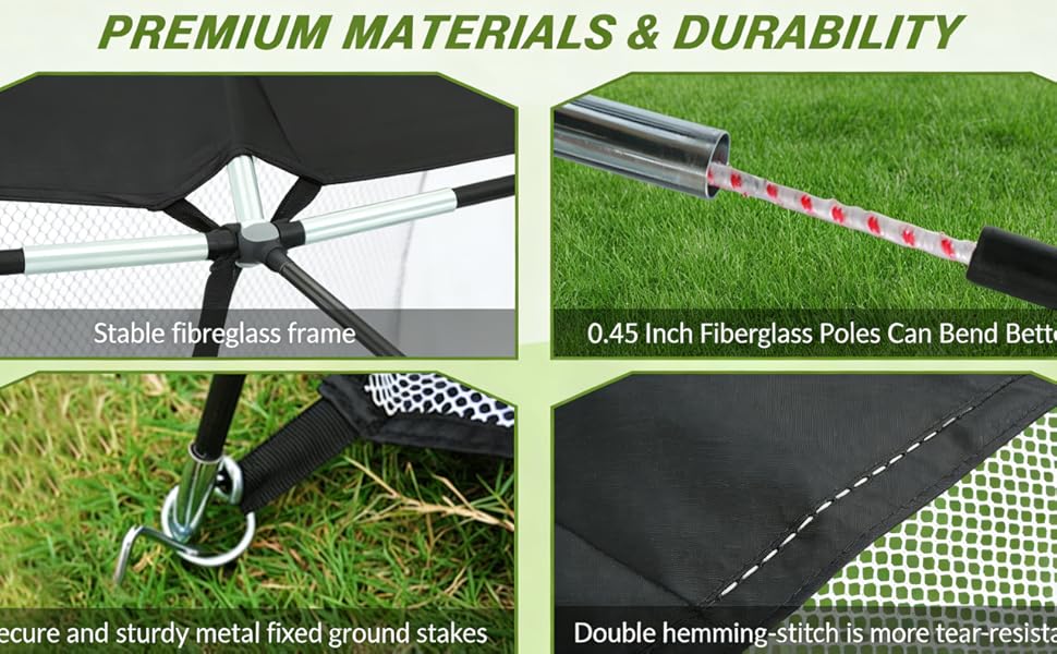 تتميز شبكة الجولف بغطاء من قماش أكسفورد 420D، وشبكة عالية المتانة 260 جرام، وإطار من الألياف الزجاجية مقاس 0.45 بوصة (مرن وقوي). تتميز السجادة بقاعدة مبطنة غير قابلة للانزلاق؛ بالإضافة إلى ذلك، 4 أوتاد أرضية معدنية تثبت الشبكة على الأسطح المستوية. إنه يتحمل تأثيرات الكرة لاستخدام طويل الأمد.