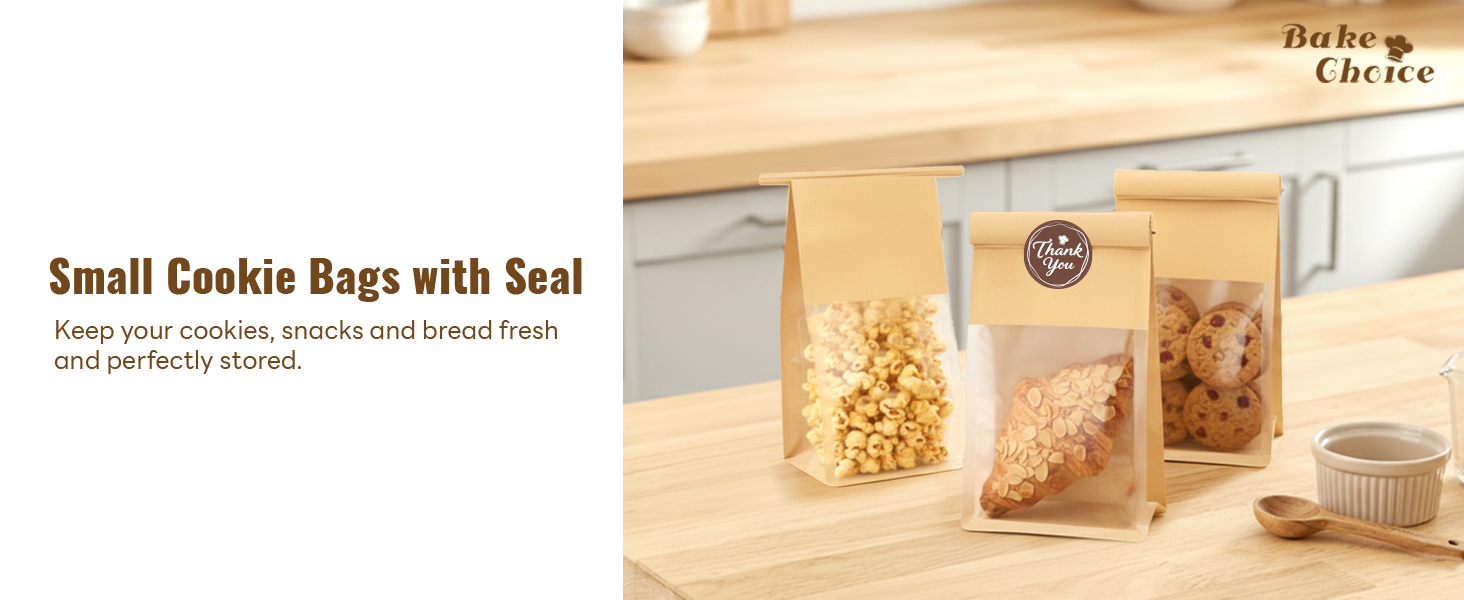 50 قطعة من أكياس البسكويت الصغيرة مع ختم، 3.9x3.1x8.2 بوصة أكياس مخبز بقفل من القصدير مع نافذة، حقيبة تغليف البسكويت الورقية القابلة للإغلاق للكعك والحلوى والبراوني والحلوى والجرانولا