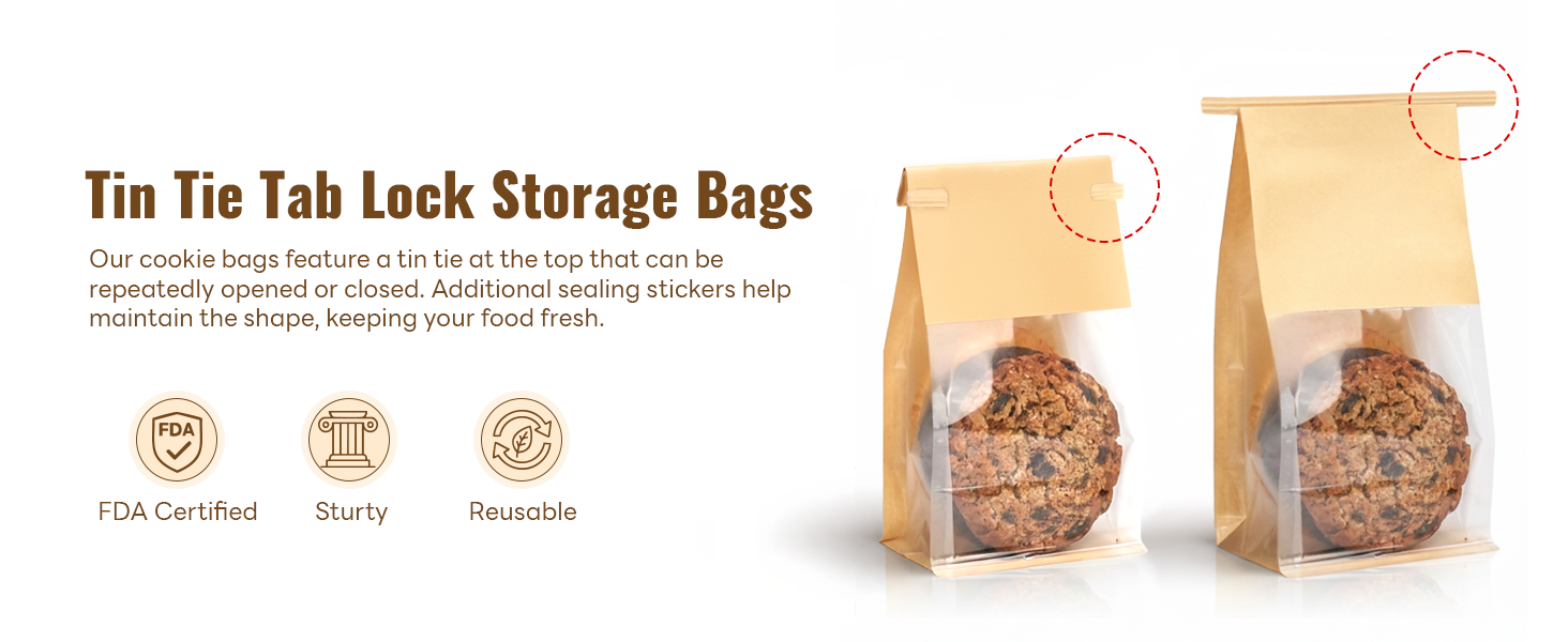 قفل نضارة من القصدير: تتميز أكياس البسكويت مقاس 3.9 × 3.1 × 8.2 بوصة بأقفال من القصدير قابلة لإعادة الاستخدام لإغلاق محكم. حافظ على ملفات تعريف الارتباط الخاصة بك محمولة ومحمية بشكل مثالي. مثالية لملفات تعريف الارتباط والجرانولا والكعك والهدايا. احتفظ بالحلويات المقرمشة لأيام أطول!