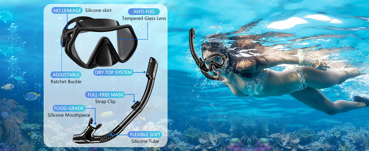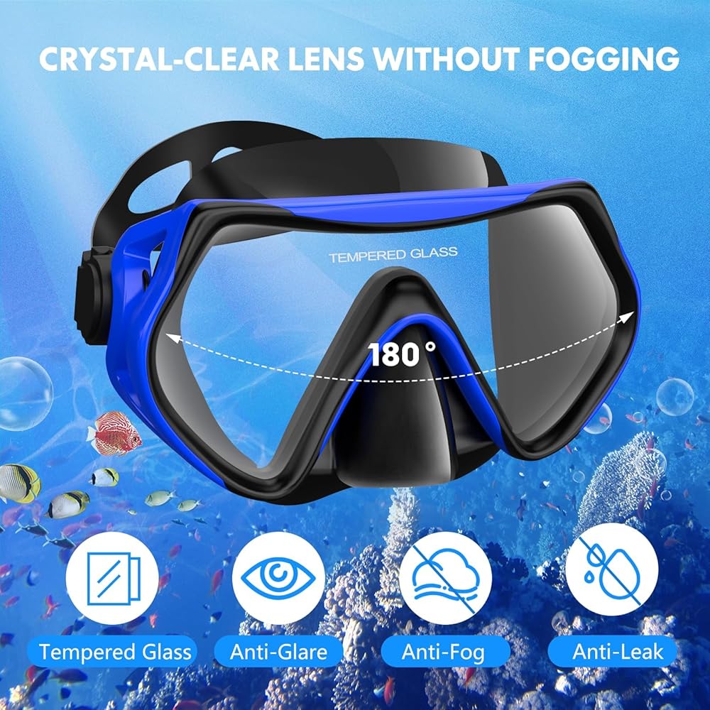 【مجموعة بانورامية 180 درجة، قناع الغطس وأنبوب الغطس مكون من 2 في 1】عدسات عالية الدقة مقاومة للصدمات ومضادة للضباب، وأنبوب تنفس من السيليكون العلوي الجاف. توفر لك مجموعة الغطس الخاصة بنا مجال رؤية 180 درجة، وتوفر مناظر فائقة لمغامرات جميلة تحت الماء. تحتوي مجموعة الغطس لدينا على المعدات التي تحتاجها للغطس لمساعدتك على استكشاف العالم تحت الماء بمرح.