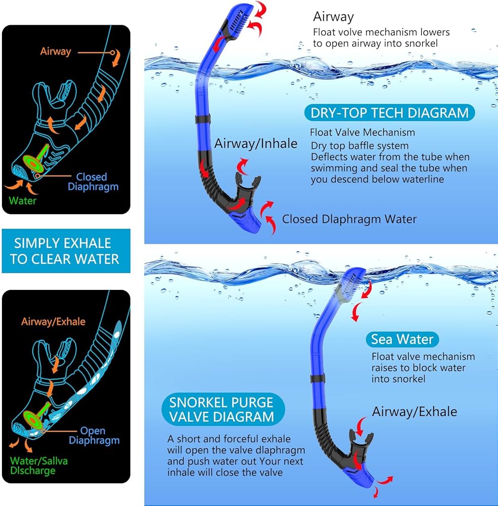 【سهولة التنفس الجاف】يعتمد أنبوب التنفس على تصميم الصمام العائم الجاف الأكثر استقرارًا ويمكن تثبيته على قناع الغطس بواسطة مشبك. عند غمره في الماء، يتم إغلاق أنبوب التنفس لمنع دخول الماء إلى أنبوب التنفس، ويمكن لصمام التنظيف السفلي تصريف الماء بسرعة. وهي ميزة أمان رائعة. حتى تتمكن من الاستمتاع بالتنفس السهل ودون عائق أثناء الغوص تحت الماء.