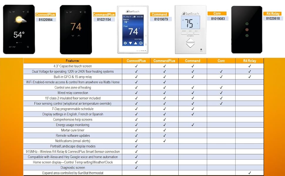 This SunTouch ConnectPlus is an industry leading thermostat that gives homeowners access to their floor heating remotely. The ability to connect this control to a home Wi-Fi system opens up features such as automatic clock setting, current outdoor temperature reading, weather compensation and warm weather shut-down. Home automation compatibility with Amazon Alexa and Hey Google. A homeowner can program this control through the Watts Home app and change settings based on a flexing schedule. Other features include energy usage monitoring, a help feature, email/text notifications, portrait and landscape mounting, away terminal features, 915MHz technology for wireless connectivity to optional equipment (SunStat Relay R4 and ConnectPlus Smart Sensor), second stage heat output, voltage level detector, ammeter, diagnostic screen, momentary test and a three year warranty. The modern, sleek design and smart applications add a modern touch to any home.