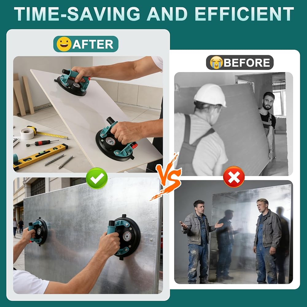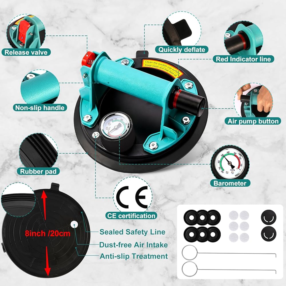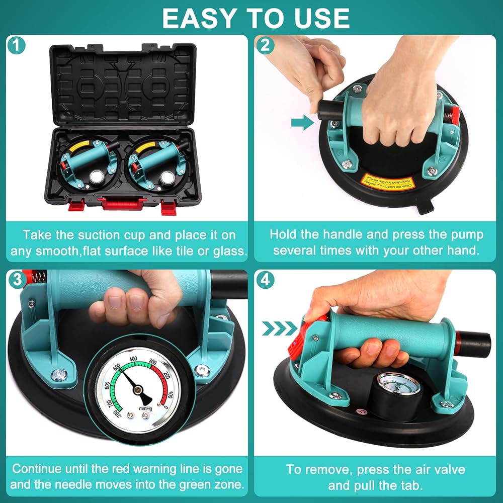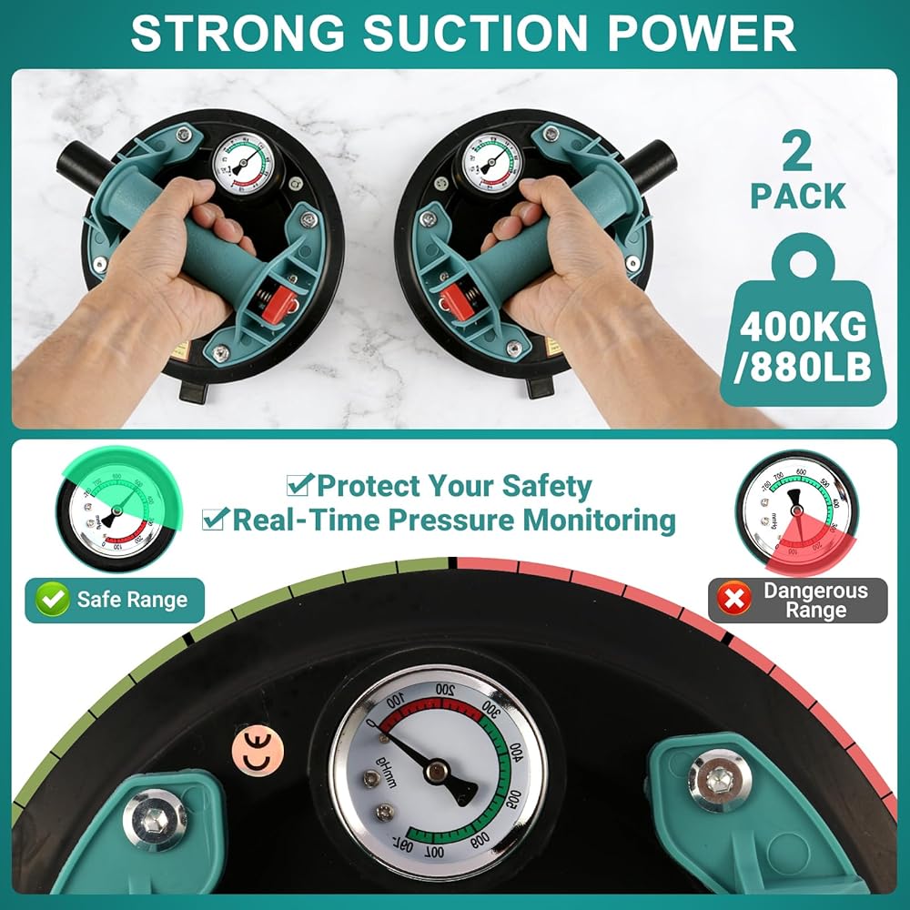 • 【Real-Time Pressure Gauge】: The barometer can provide clear, real-time vacuum status. Always confirm the pointer is in the green “safe” zone before lifting. Please use the glass lifting suction cups only on smooth, sealed surfaces and avoid rough, wet, or porous materials for optimal safety and longevity.