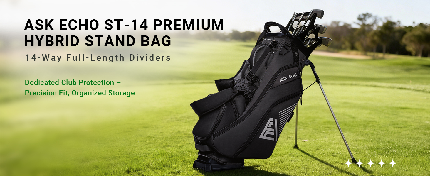 The ST-14 + Pendor is built for golfers who want full organization without crowding the top of the bag. 14-Way Full-Length Divider Top PENDOR External Club Organization System Patented Auto-Adjusting Dual Shoulder Strap System External Putter Clip Quick-Access Magnetic Pocket Lightweight Support Legs Weighs 7.61 lbs Premium Fine-grain Nylon