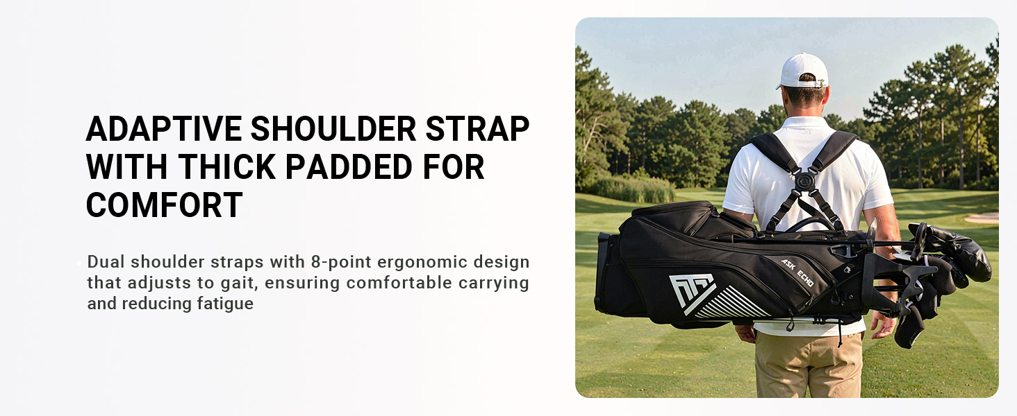 Adaptive Padded Shoulder Straps: Dual shoulder straps feature an 8-point ergonomic design that adapts to your natural gait, delivering exceptional comfort and reduced fatigue throughout your round