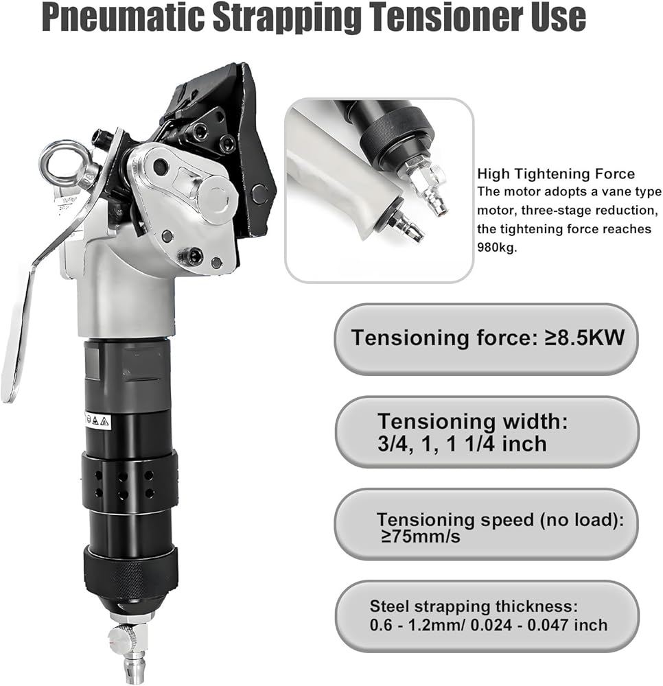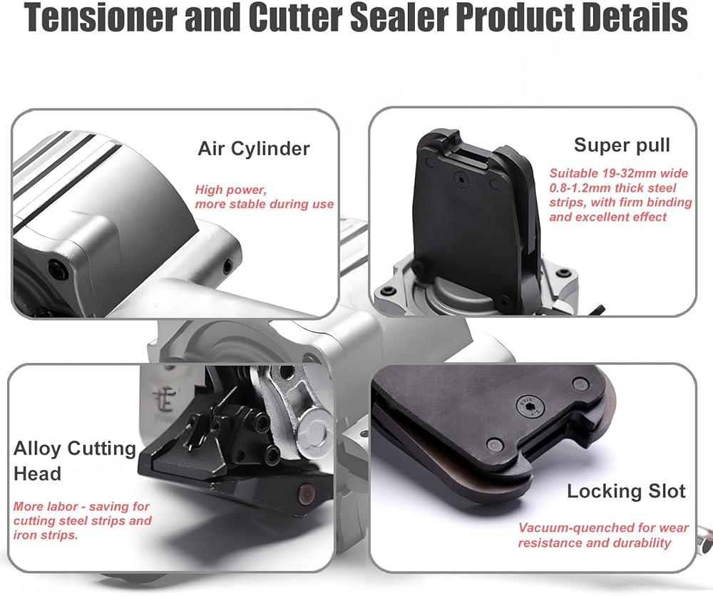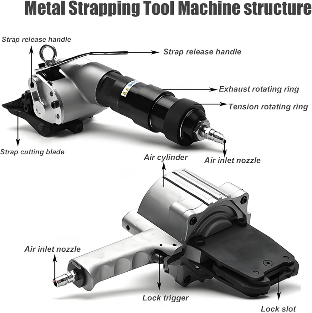 • 【All-Metal Durable Construction】:Air-Powered Metal Banding Tools Full die-cast steel bodies with hardened helical gears Crafted from high-strength die-cast steel, the tool is drop-resistant and corrosion-resistant, ensuring long service life even in tough warehouse or jobsite environments. Its lightweight yet solid build withstands daily use.