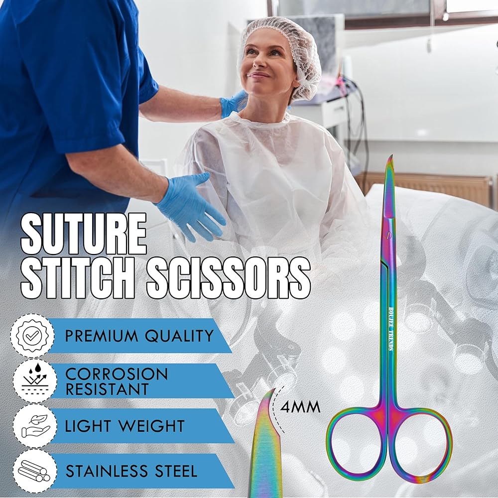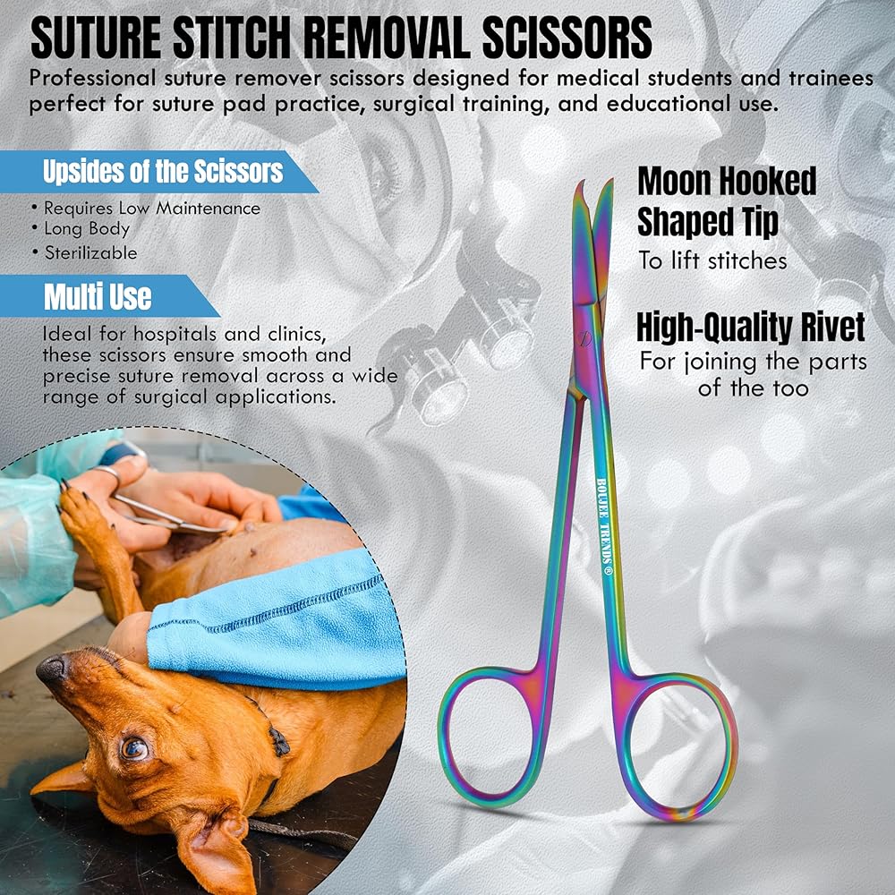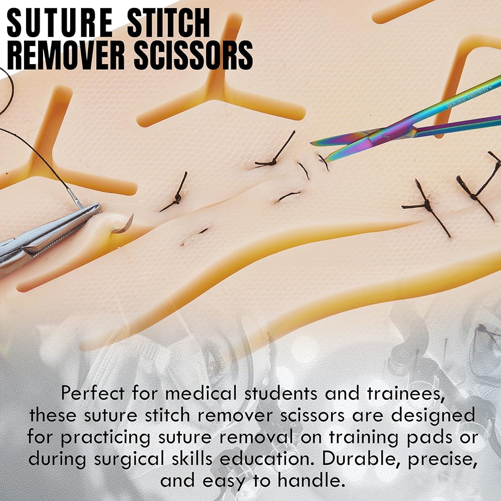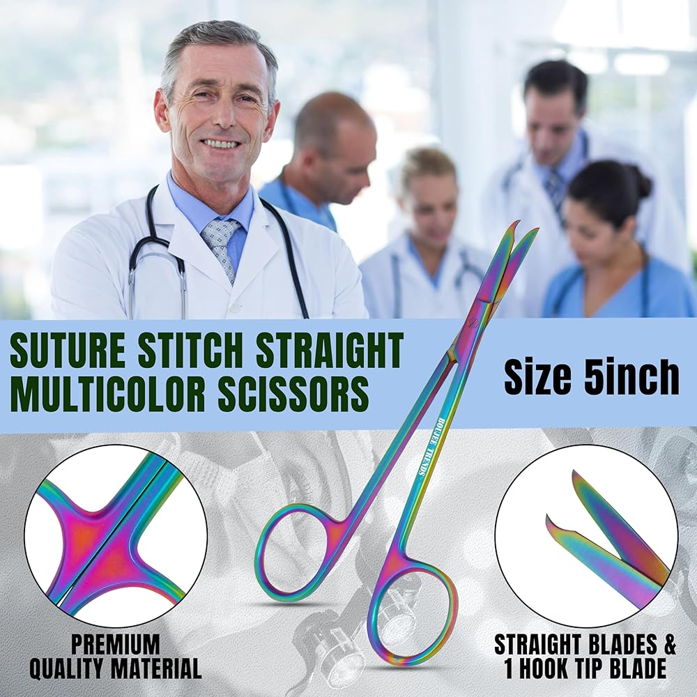 Suture Stitch Scissors with Multicolor/Rainbow Titanium Coating - Premium Quality Instrument- Delicate Hook - Perfect for Suture Removal, First Aid, EMS Training and More (4.5 in. - Straight)