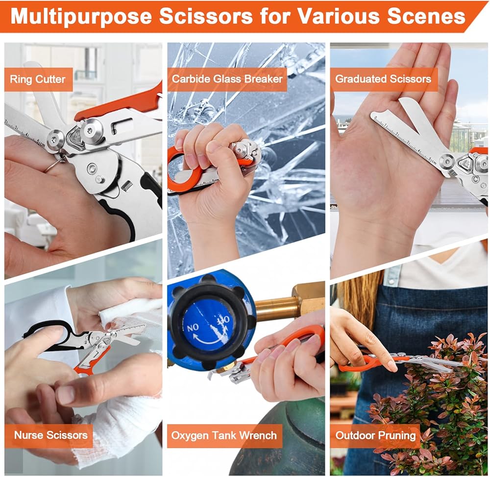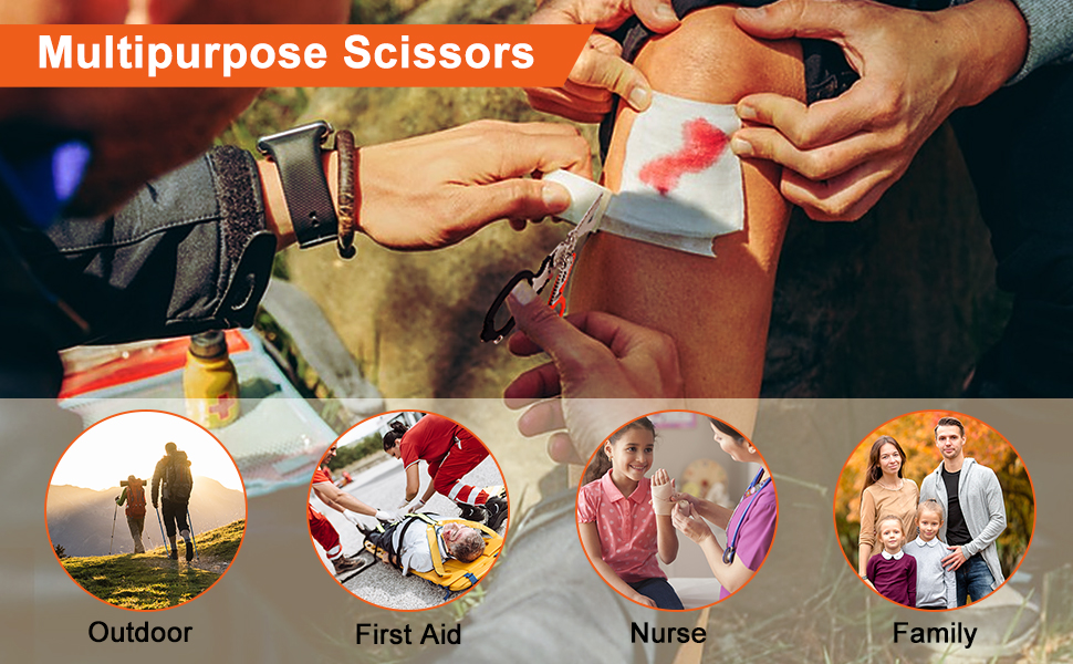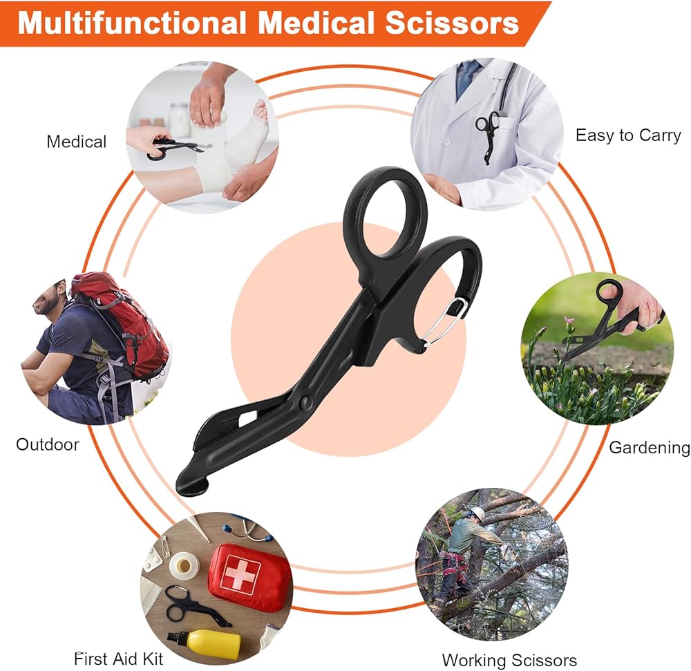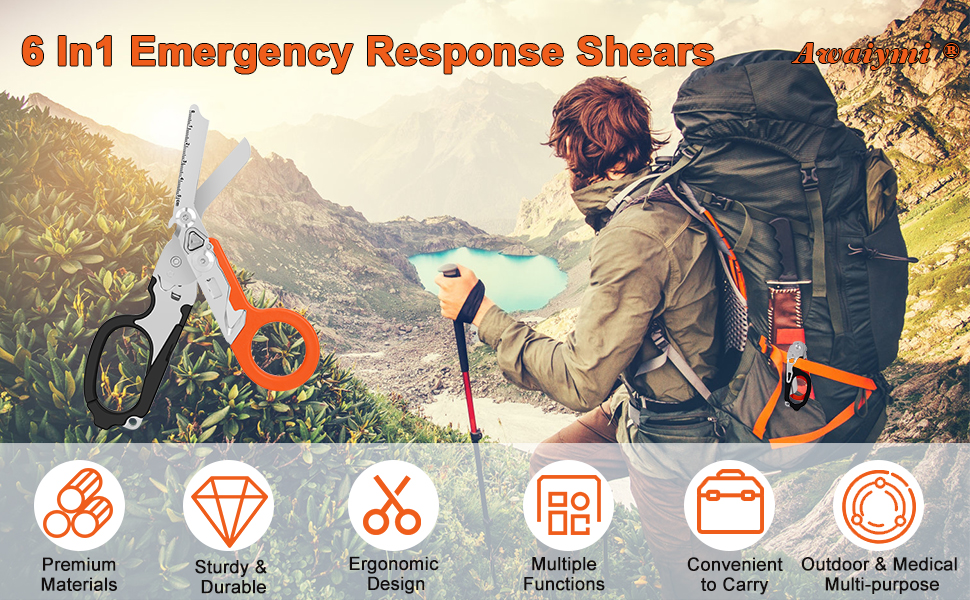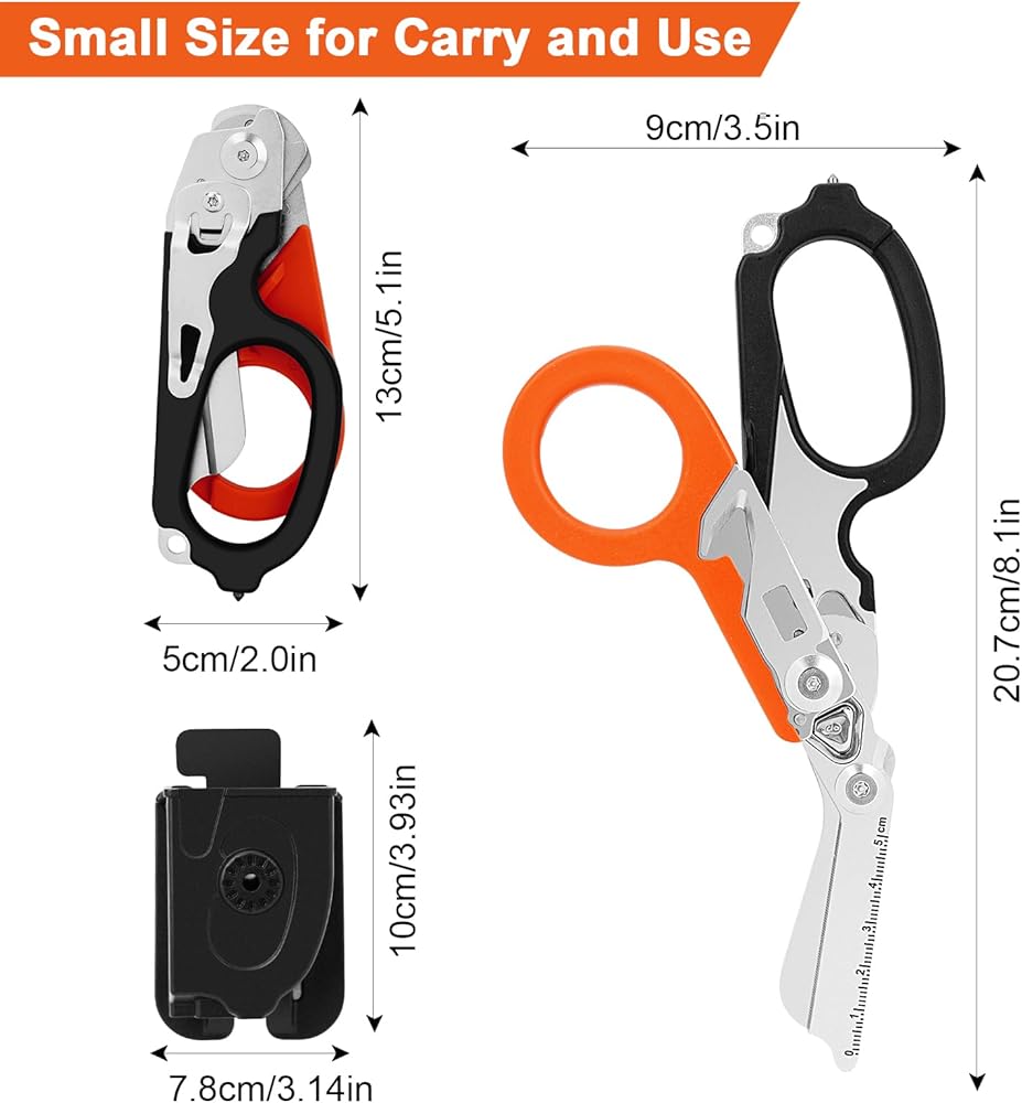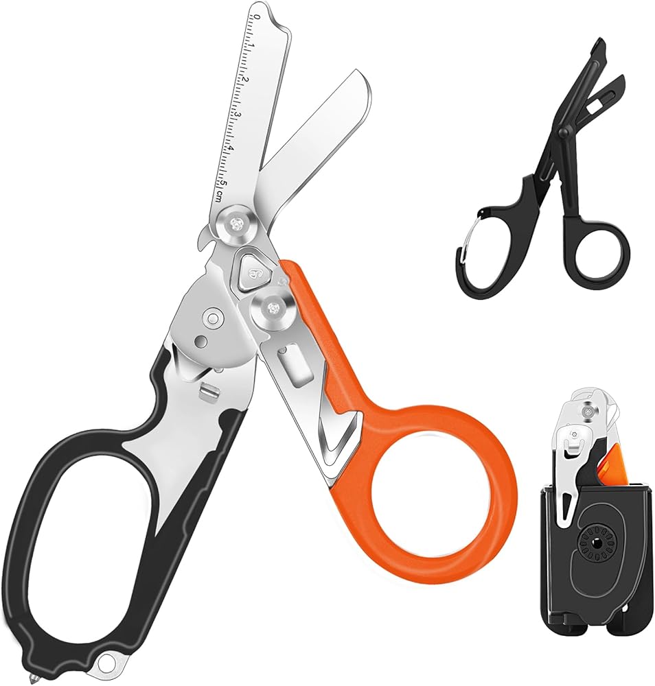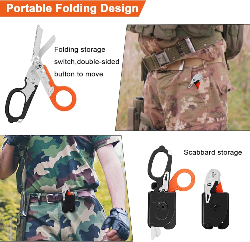 مقصات الصدمات متعددة الوظائف 6 في 1 مع حافظة، مقصات استجابة للطوارئ قابلة للطي من الفولاذ المقاوم للصدأ، أدوات مقص طبي للتخييم في الهواء الطلق، غمد مع مقص EMT (أسود + برتقالي)