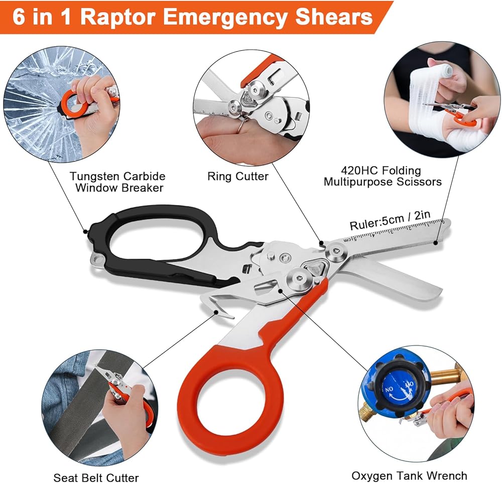 ✅6 في 1 مقصات الصدمات متعددة الوظائف - تحتوي مقصات الصدمات هذه على 6 وظائف أساسية، والتي يمكن استخدامها كمقصات للحزام، ومقصات حلقية، ومساطر، ومفاتيح خزان الأكسجين، وكسارات الزجاج الكربوني على التوالي. تُعد أدوات معالجة الصدمات هذه أداة أساسية للمحترفين الطبيين في حالات الطوارئ ويمكن أن تكون أيضًا إضافة قيمة لمنزلك.