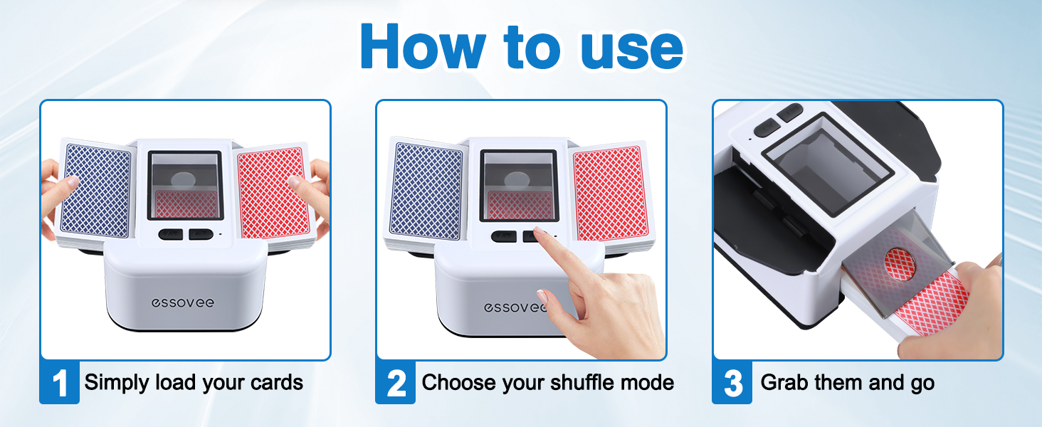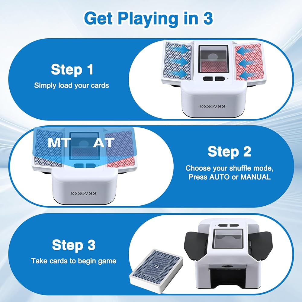 تشغيل بلمسة واحدة بدون مجهود: تتمتع ماكينة خلط البطاقات بالراحة القصوى بضغطة واحدة فقط. يتولى خلط البطاقات مهامه بفضل تقنية الاستشعار الذكية، حيث يتم إيقاف تشغيله تلقائيًا بمجرد اكتمال الخلط. يوفر هذا التصميم بدون استخدام اليدين الوقت والجهد، مما يجعله مثاليًا لليالي اللعب الممتدة أو الحفلات المفعمة بالحيوية متعددة اللاعبين.
