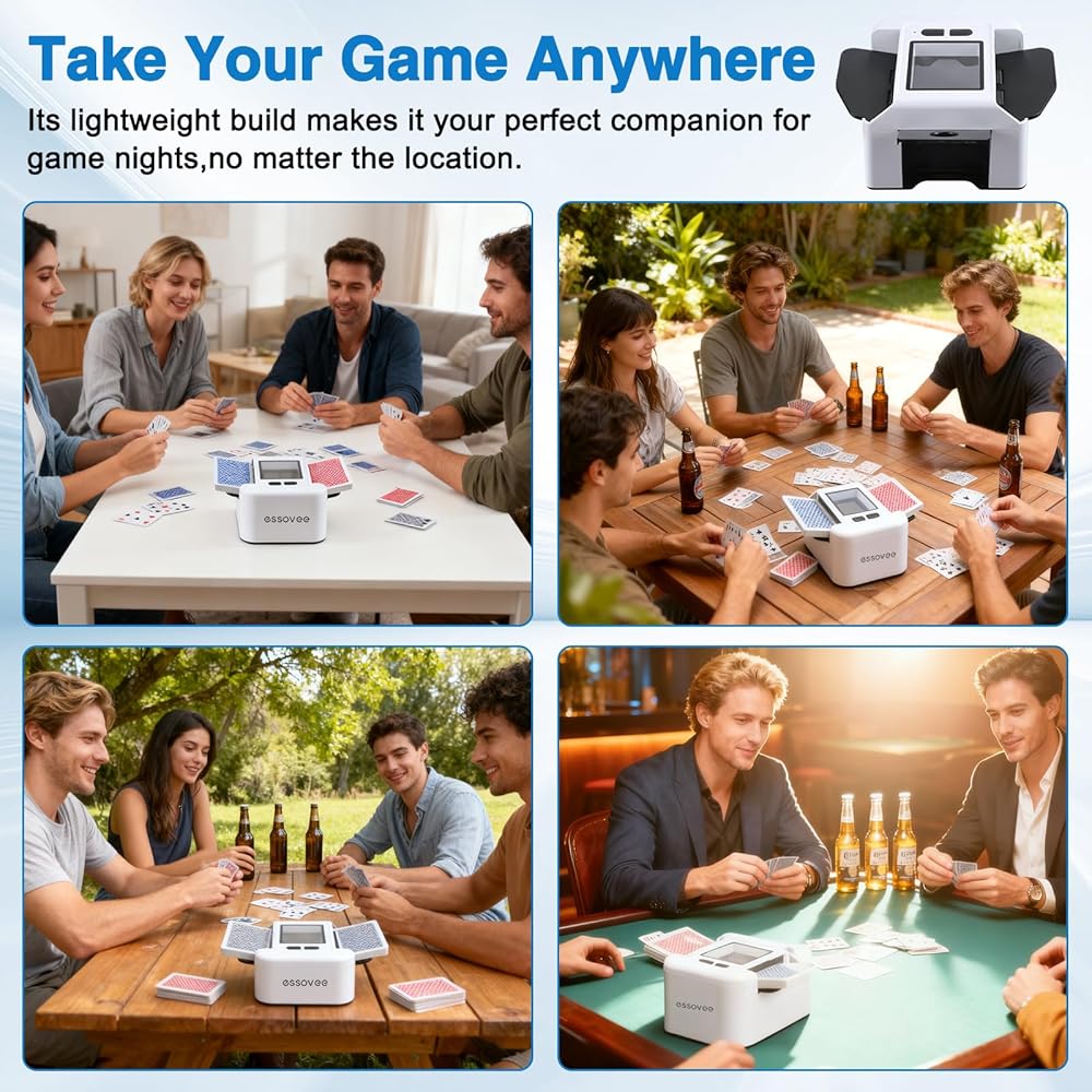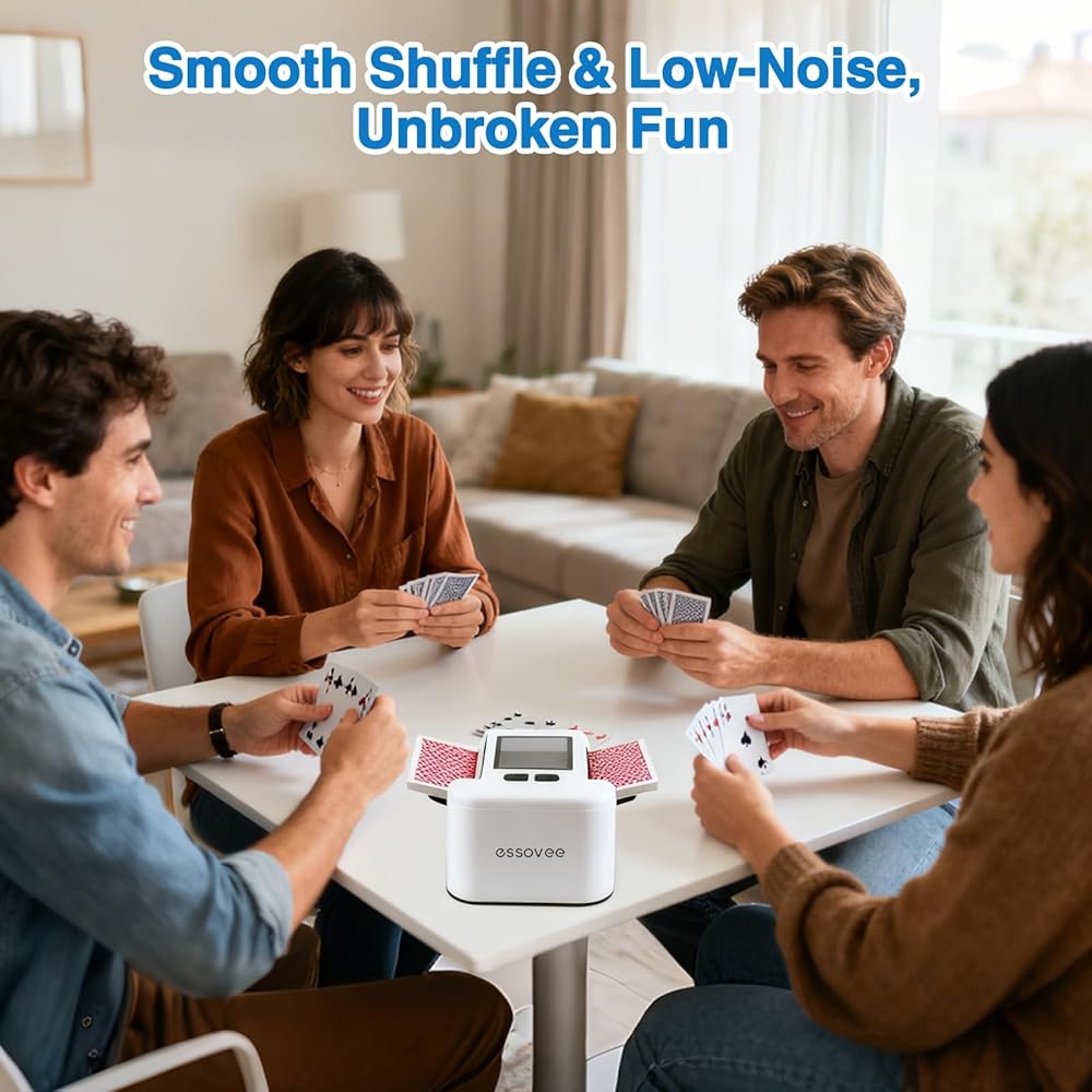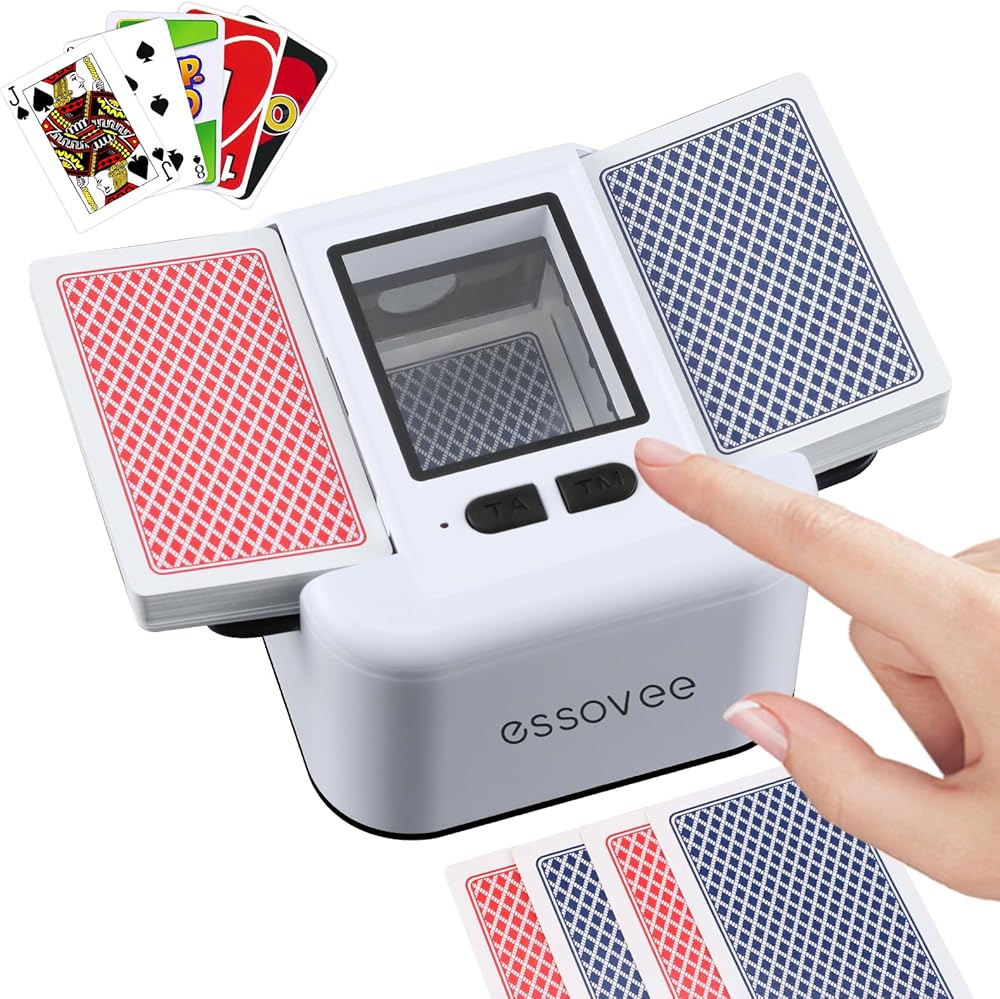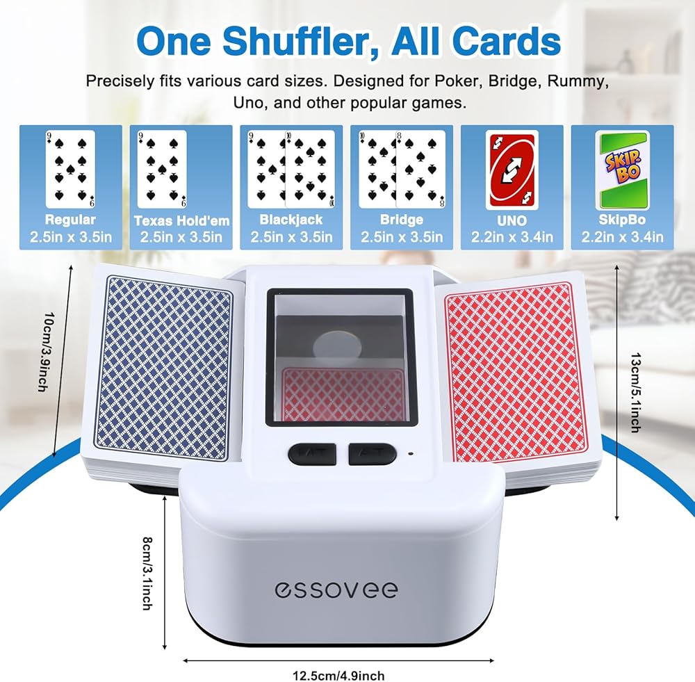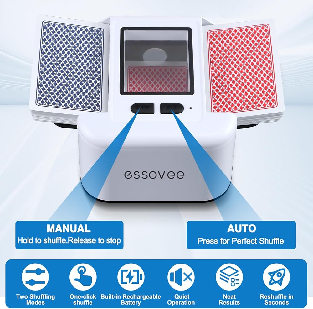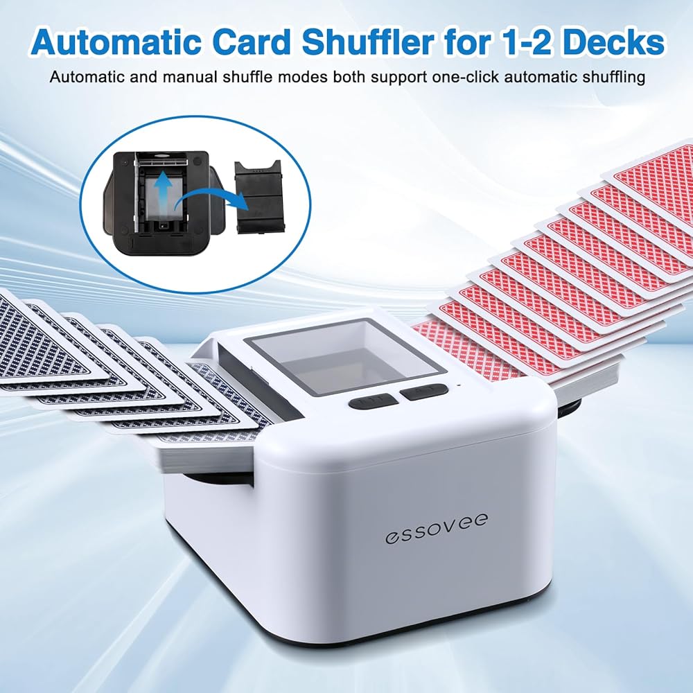 توافق البطاقة الكل في واحد: خلط البطاقات التلقائي يتقن كل ليلة لعب. يخلط بخبرة 1-2 مجموعة من بطاقات البوكر، وUNO، وBridge، وRummy، وBlack Jack، وغيرها من البطاقات الكلاسيكية بسهولة. تضمن الأدلة الجانبية القابلة للتعديل قبضة مثالية للأحجام المختلفة، مما يوفر خلطًا سريعًا وعادلاً حتى تتمكن من التركيز على اللعبة.