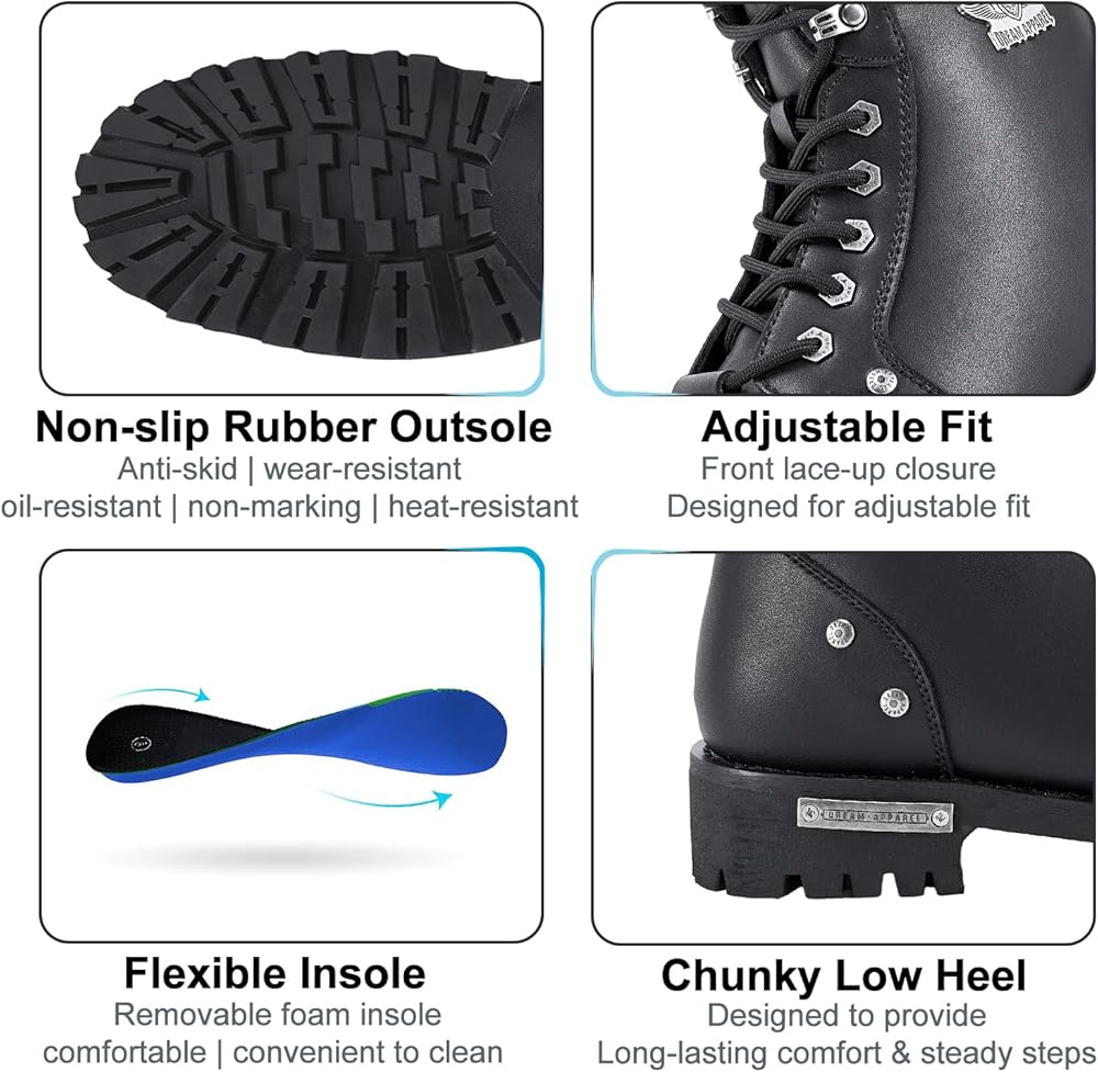مظهر أنيق وملاءمة قابلة للتعديل - تتميز أحذية الدراجات النارية الرجالية بكعب مكتنز ومقدمة مستديرة بمظهر أنيق ومظهر رائع. الأجهزة الفضية تجعل أحذية راكبي الدراجات النارية فريدة وعصرية. أربطة أمامية قابلة للتعديل ومزخرفة مصممة لتناسب مثالي. تتناسب بشكل جيد مع الجينز والسراويل. يمكنك الركوب بأناقة مع حذاء الدراجات النارية الرائع هذا. مناسبة لركوب الدراجات النارية، والتسوق، والمواعدة، والشارع، والنوادي، والمدرسة، والمكتب، والحفلات، والخارج، والارتداء اليومي وما إلى ذلك.