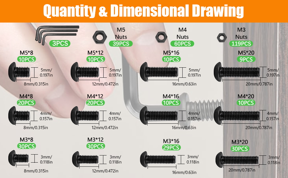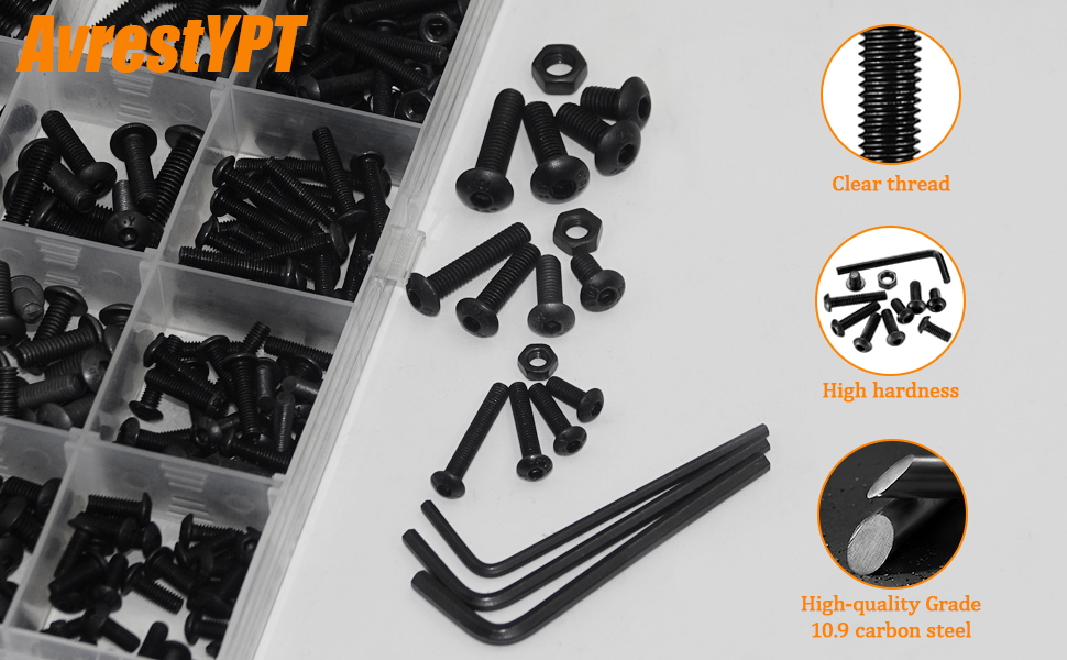 هيكل من سبائك الصلب الفاخر: مصنوع من سبائك فولاذية عالية الجودة 12.9، ومساميرنا المترية والصواميل والغسالات مقاومة للتآكل، وتمنع الصدأ، وتجنب الكسر، مما يضمن طول عمر مشاريع الأجهزة، وتجميع الطابعة ثلاثية الأبعاد، ومهام DIY.