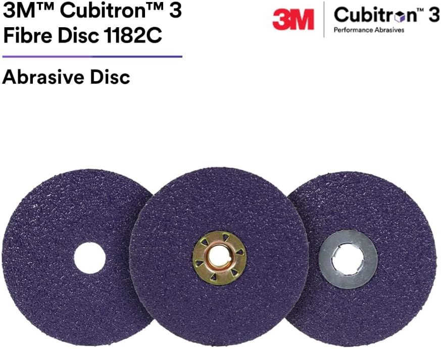 The 3M™ Cubitron™ 3 Fibre Disc 1182C features re-engineered 3M Precision Shaped Grain — taking the legendary speed and life of 3M™ Cubitron™ Performance Abrasives to a whole new level. These product benefits include allowing for increased productivity and lower overall grinding costs vs. other fiber discs and depressed center grinding wheels when grinding mild or carbon steels. Delivering up to 60% more total material removed compared to the 3M™ Cubitron™ II Fibre Disc 982C, 36+, this long-lasting fibre disc has a fast cut rate with high stock removal across a wide range of application pressures. Additionally, this disc is designed to help reduce exposure to hand-arm vibration, increase throughput, and complete more parts-per-disc when tackling medium to high-pressure grinding applications.
