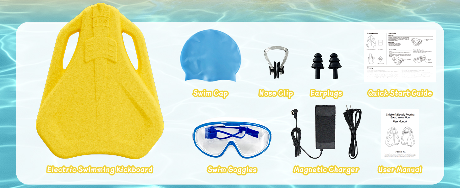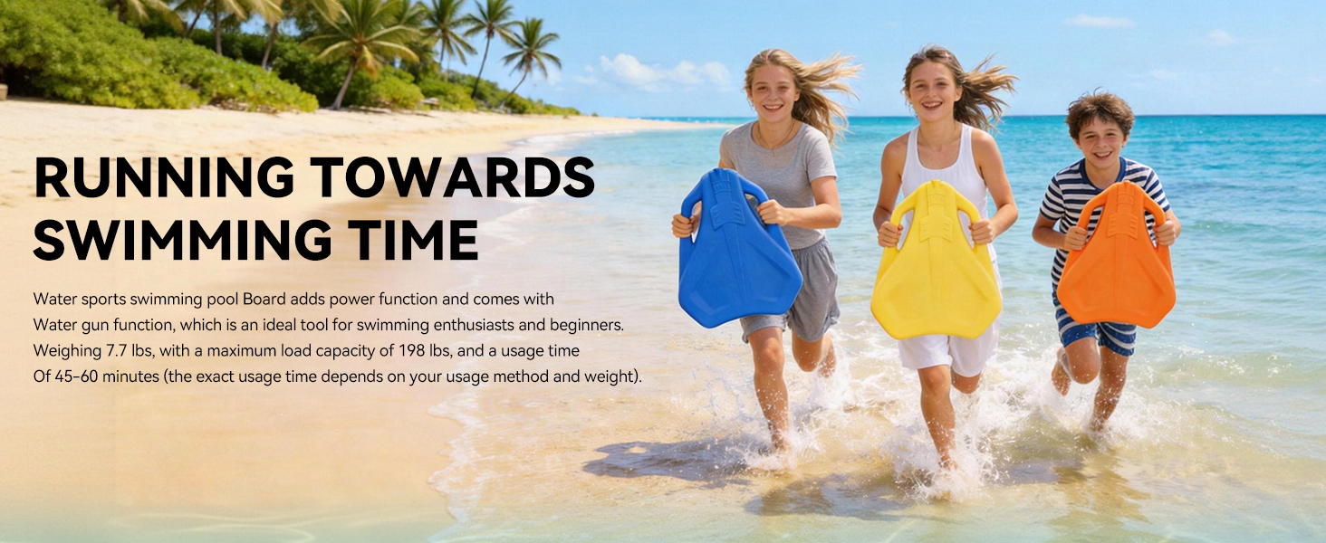 Discover the perfect blend of swimming training and exciting water play with our advanced Electric Swimming Kickboard! Designed with beginners in mind, it delivers strong 6.12kgf thrust and speeds up to 1m/s to support balance and confidence in the water. Plus, enjoy endless fun with the built-in water gun that sprays over 20 feet—perfect for pool games and beach days. Built with safety and ease in mind, this kickboard features a simple push-button control: hold to start, release to stop. The fully sealed, IPX8 waterproof design, safety grille-protected propeller, and positive buoyancy EPP+ABS construction ensure worry-free floating and durability. It supports up to 132 lbs and stays afloat even when powered off. With a long-lasting 24V/4.6Ah battery providing 45–60 minutes of continuous runtime and a quick 2.5-hour recharge, the fun never stops. Lightweight yet tough, it's ideal for travel, swim lessons, or family pool time. Recommended for ages 12+ with adult supervision. Bring home the kickboard that trains, entertains, and protects—your go-to for summer fun and swimming progress! Please note that electric swim kickboards are recommended for children 36 months and older to use with parental supervision.