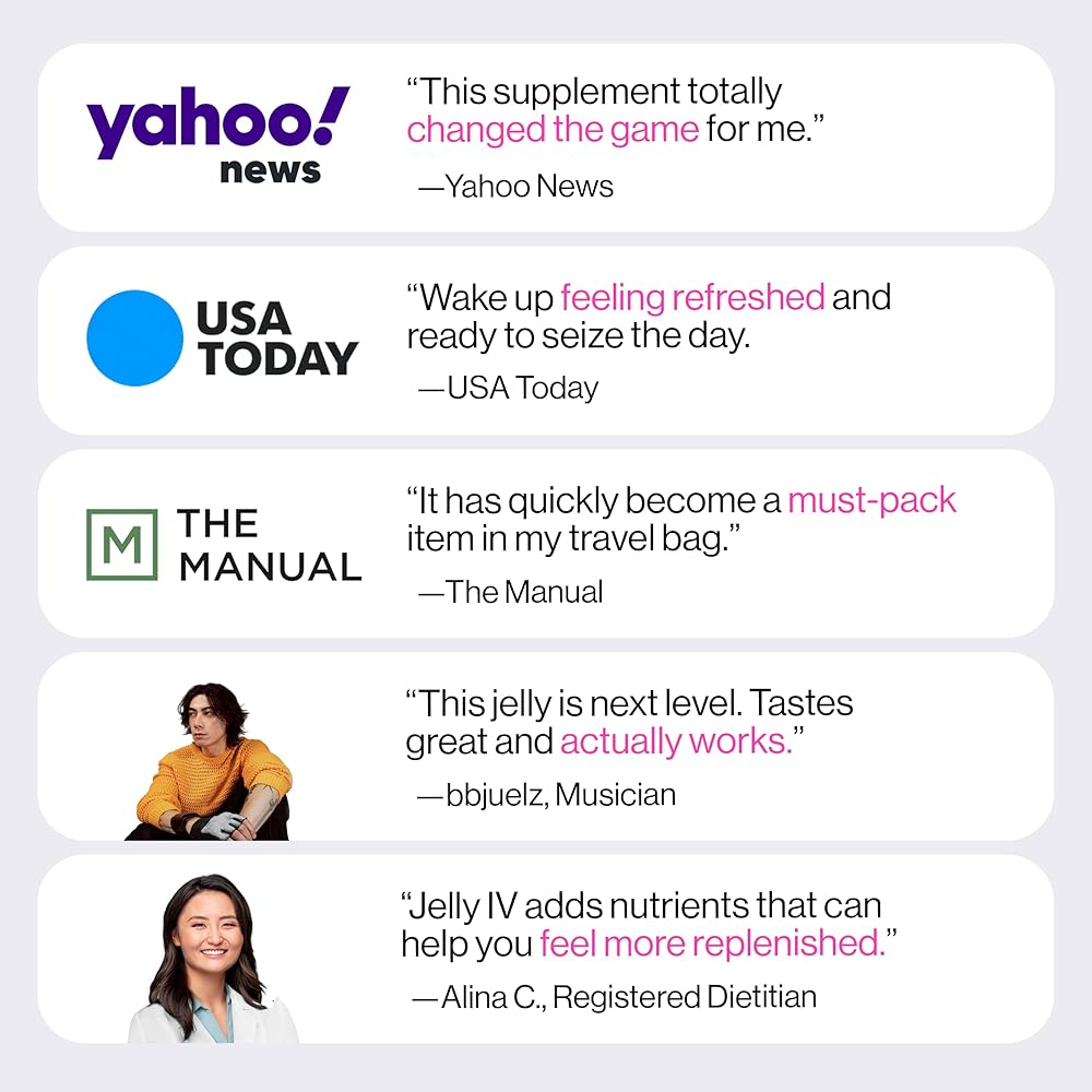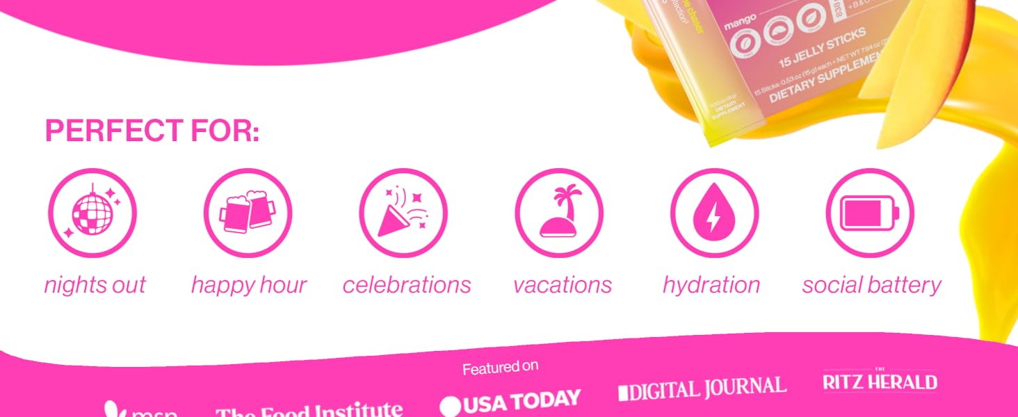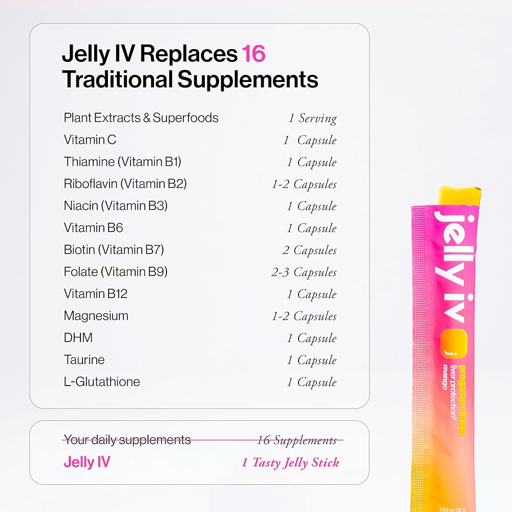 كيف يعمل: عندما تشرب الكحول، يترك الكحول وراءه منتجًا ثانويًا سامًا يسمى الأسيتالديهيد في القناة الهضمية. هذا المنتج الثانوي، وليس الجفاف، هو الذي يسبب خشونتك في اليوم التالي. يساعد مزيج Jelly IV، الذي تم تركيبه بواسطة علماء الكيمياء الحيوية، على دعم وظائفك الطبيعية لتكسير الأسيتالديهيد بشكل أكثر فعالية.
