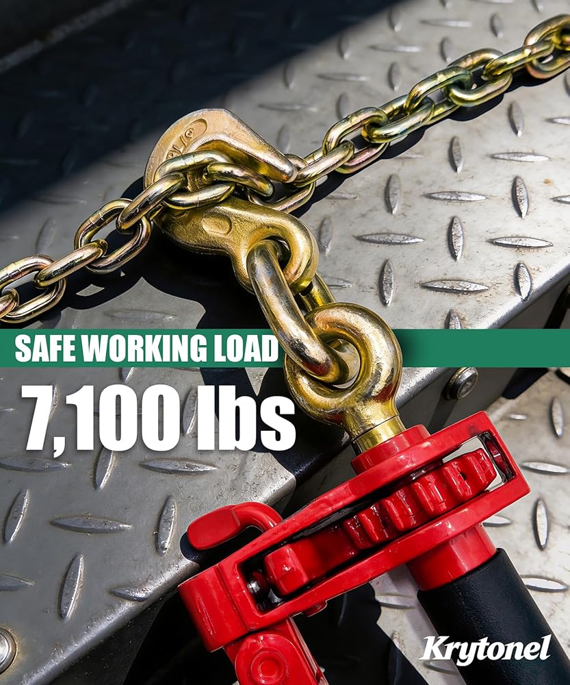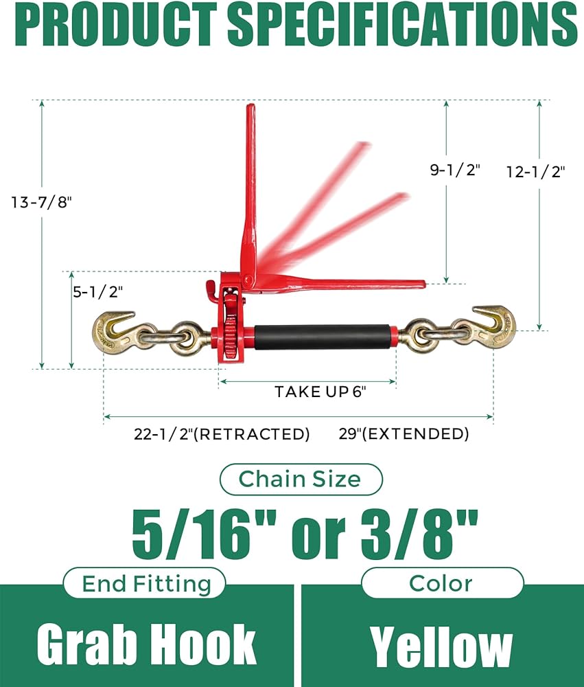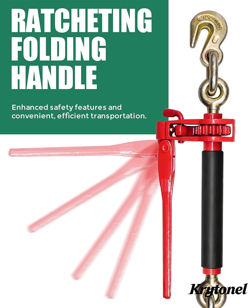 • تأمين الأحمال الثقيلة بشكل أسرع مع مقبض قابل للطي: عبوة من قطعتين من كريتونيل 5/16 بوصة - 3/8 بوصة بمقبض قابل للطي شديد التحمل توفر سلسلة السقاطة حد حمل عمل يصل إلى 7,100 رطل وقوة كسر تصل إلى 28,400 رطل، مما يجعل التشديد سريعًا وآمنًا للشاحنات المسطحة والمقطورات