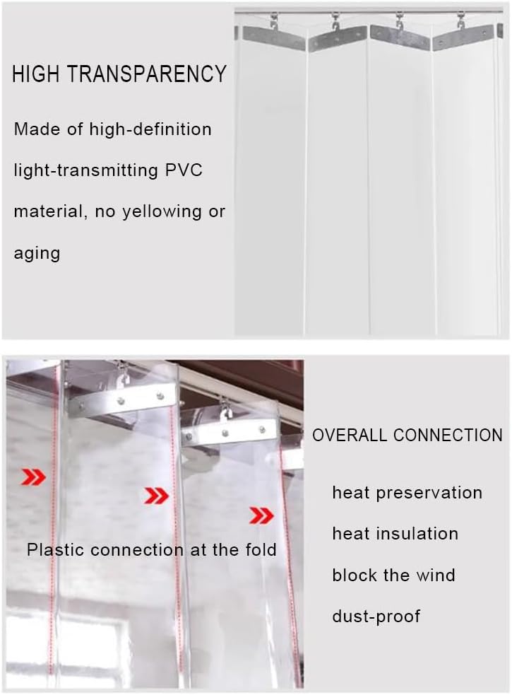 • 3,Weather Resistance: Windproof, Snowproof, Rainproof, Waterproof, Cold. This PVC Strip Curtain effectively reduces Noise, Dust, and Pollution, providing a barrier to prevent contaminants from entering designated areas. Ideal for various environments, it enhances comfort and cleanliness while maintaining visibility and accessibility. Perfect for industrial and commercial applications.