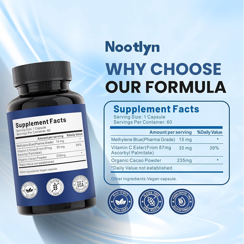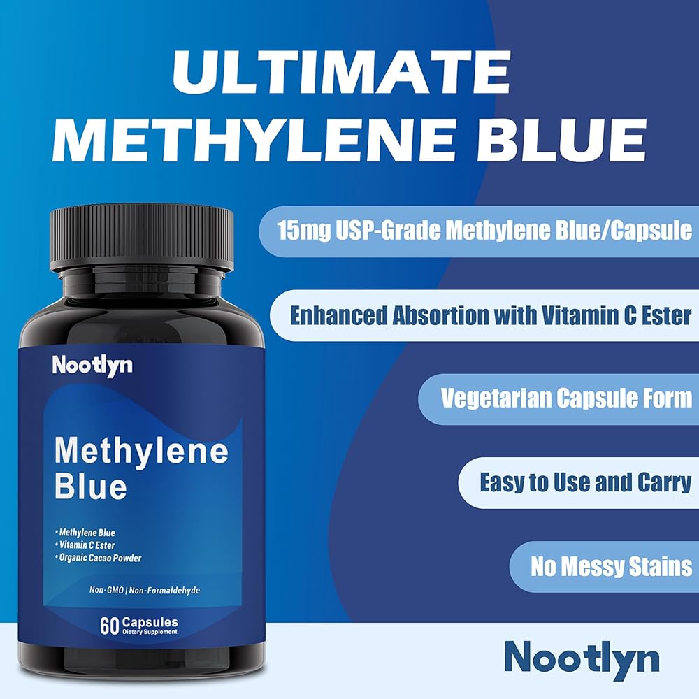 جودة من الدرجة الصيدلانية: تم تركيبه من أزرق الميثيلين عالي النقاء في عملية يتم التحكم فيها بعناية لضمان جودة ثابتة في كل كبسولة. مصمم لأولئك الذين يقدرون المكملات النظيفة والموثوقة.