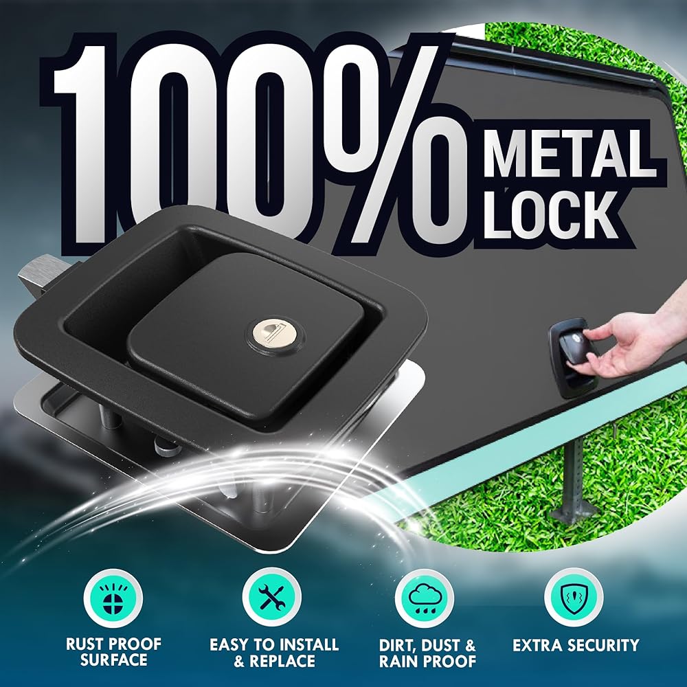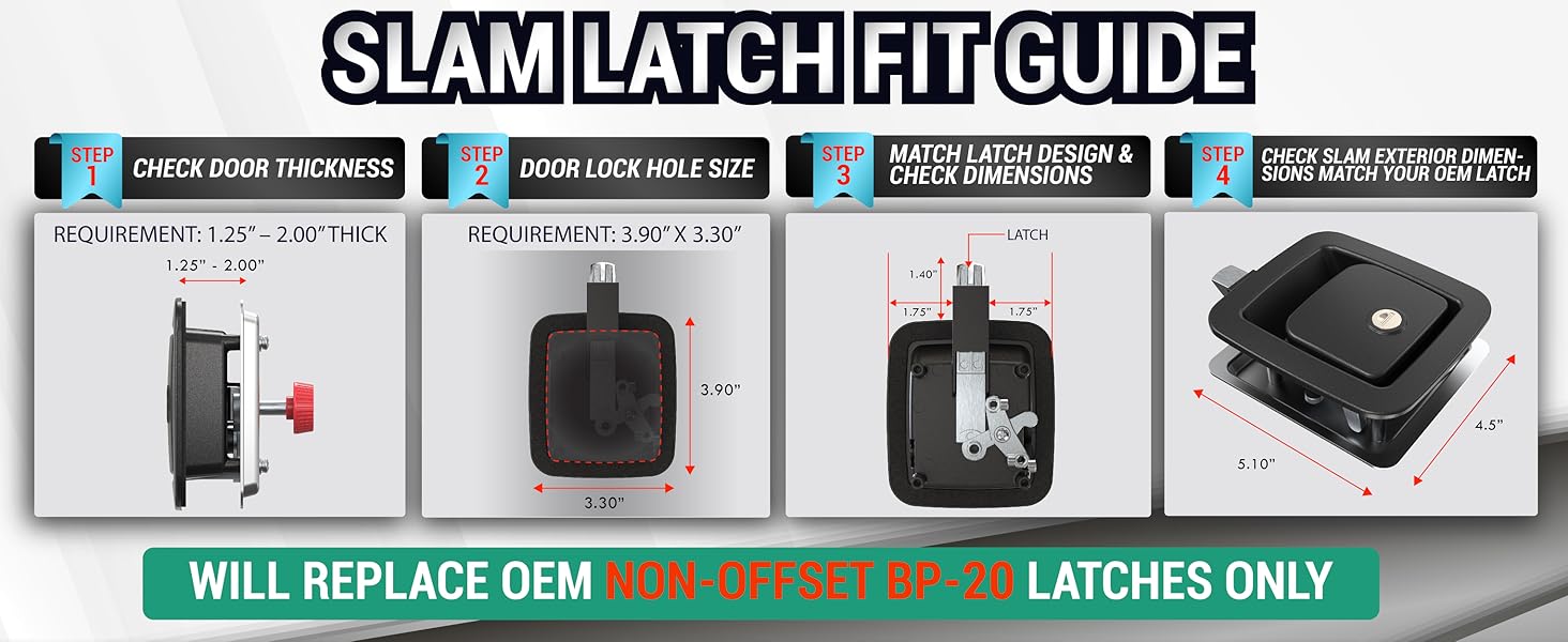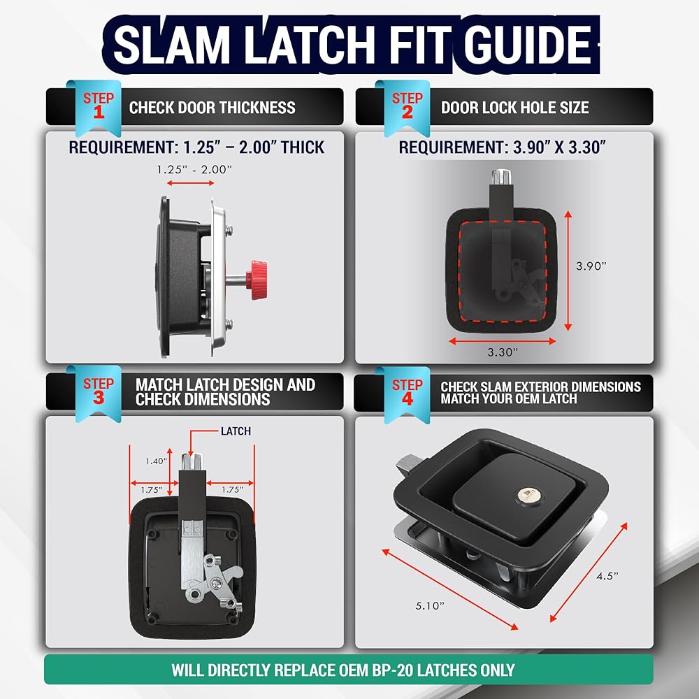 ✅ هل تناسب مركبتك الترفيهية؟ يناسب هذا المزلاج فتحات الأبواب التي يبلغ قياسها 3.90 بوصة (ارتفاع) × 3.30 بوصة (عرض) ويعمل على الأبواب بسُمك 1.25 بوصة - 2.00 بوصة. المقاس الخارجي 5.10 بوصة (ارتفاع) × 4.50 بوصة (عرض). قبل الشراء، تحقق من نمط المزلاج الحالي الخاص بك، هذا الطراز يناسب فقط المزالج التي تحتوي على آلية القفل في المركز، وليس تصميمات الإزاحة.