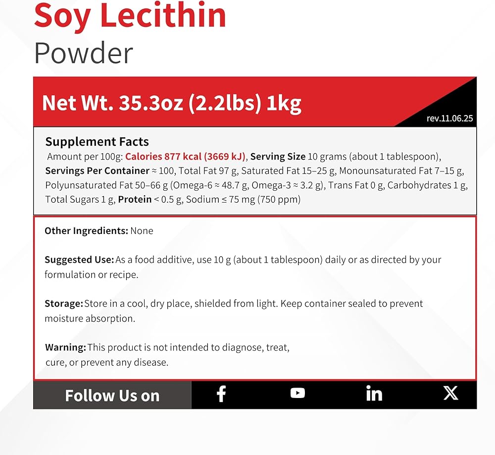 المكونات السائبة للتصنيع: 1 كجم (2.2 رطل) من مسحوق ليسيثين الصويا. المواد الخام للاستخدام التجاري أو الصناعي الصغير إلى المتوسط النطاق وتطوير المنتجات. ليس للاستهلاك المباشر. معالجة إضافية مطلوبة. قد تختلف التعبئة والتغليف.