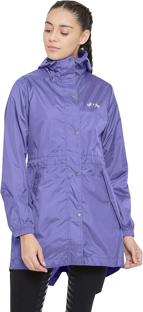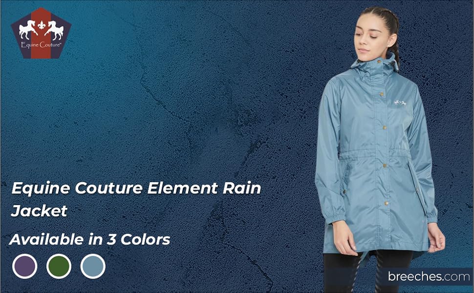 The Equine Couture Element Rain Jacket is perfect for protecting your show coat from the weather in between classes or doing barn work on a rainy day. Waterproof, breathable and wind-blocking, this classic three-quarter length jacket features lightweight fabric. A zipper paired with metal snaps allow for maximum coverage to block out unwanted weather. An adjustable elastic hood seals out the wind and rain to keep you dry while you ride or do barn work Achieve that fitted look with an adjustable elastic waist. Convertible split coat tails make sure you don't sit on your jacket and keep contact with the saddle. Extra large pockets will easily hold a smartphone, extra gloves and treats!