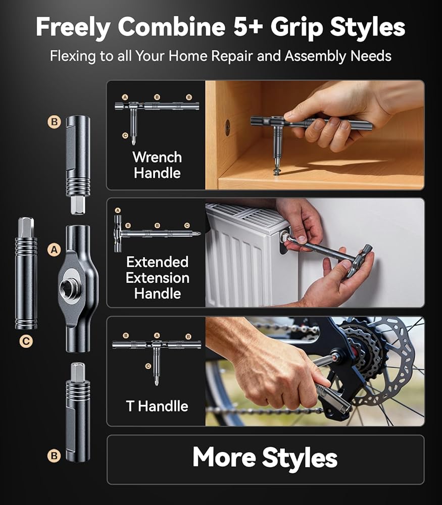 [5+ تكوينات احترافية للمقبض: التعامل مع أي وظيفة مثل المحترفين] يتم تجميعها بسهولة في أكثر من 5 أشكال عملية لتتناسب مع كل مهمة: مقبض طويل قياسي (مسمار عادي)، مقبض على شكل حرف T (أقصى عزم دوران للمسامير العالقة)، مقبض قصير مدمج (فجوات الخزانة الضيقة)، تكوين مفتاح الربط (شد/فك الصمولة)، مقبض تمديد ممتد (مسامير يصعب الوصول إليها في الأثاث العميق). سواء كنت تقوم بتركيب الأرفف، أو تثبيت المفصلات، أو تجميع ألعاب الأطفال، فستكون لديك الأداة المناسبة لهذه المهمة - فلا حاجة بعد الآن إلى استدعاء عامل ماهر للقيام بالإصلاحات الصغيرة.