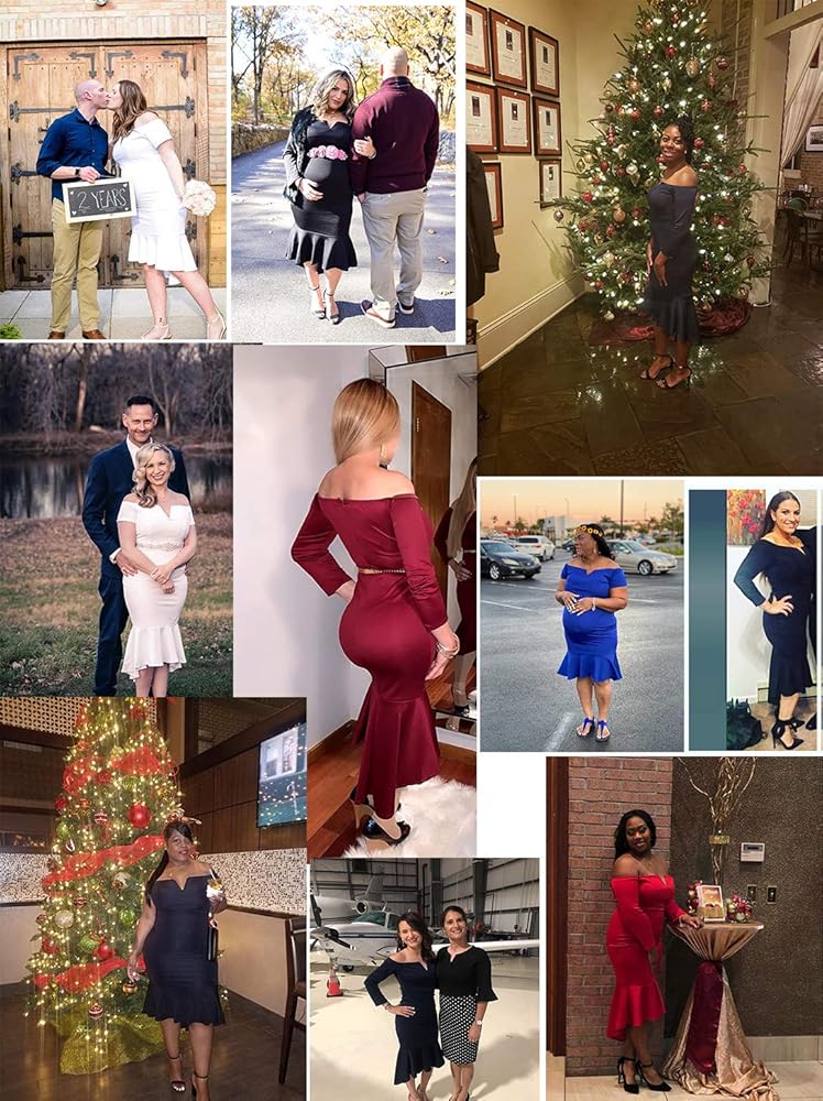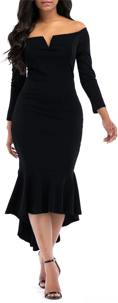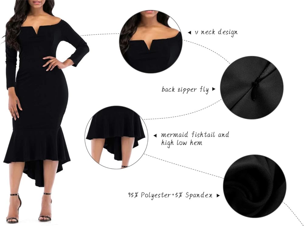 فساتين ذيل السمكة من Onlypuff للنساء فستان متوسط ​​الطول بأكمام طويلة ورقبة على شكل حرف V فستان كوكتيل