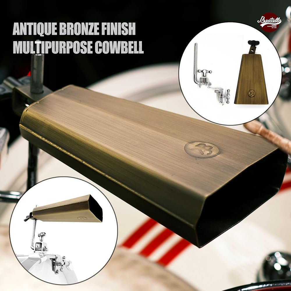 Product Specifications: Brand: Beatello Material: Heavy-Duty Handmade Steel Finish: Antique Bronze / Vintage Includes: Cowbell + Multipurpose Mounting Stand