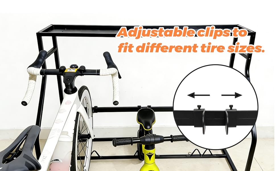 تصميم قابل للتعديل ومستقر: يتميز بتصميم مشبك قابل للتعديل وقاعدة أخدود على شكل حرف M، فهو يناسب مقاسات عرض الإطارات المختلفة ويوفر موقفًا ثابتًا لمنع الدراجات من الانقلاب أو الخدش