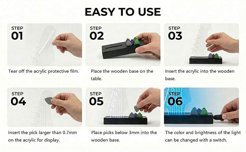 شاشة أكريليك بقاعدة خشبية: تظهر فتحة الأكريليك الشفاف اعواد الجيتار بدقة، بينما توفر القاعدة الخشبية مساحة تخزين لعدة قطع تصل إلى 3 مم. يغطي فيلم الحماية الأكريليك أثناء الشحن للمساعدة في منع الخدوش.