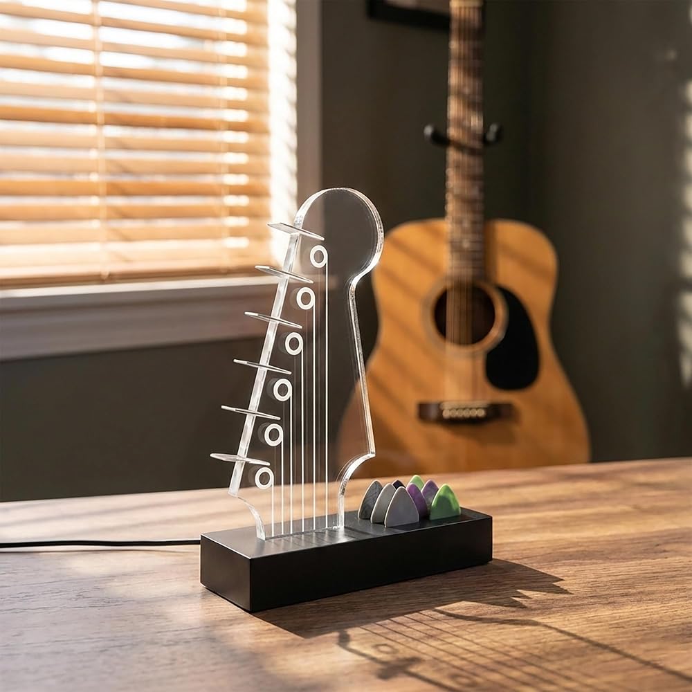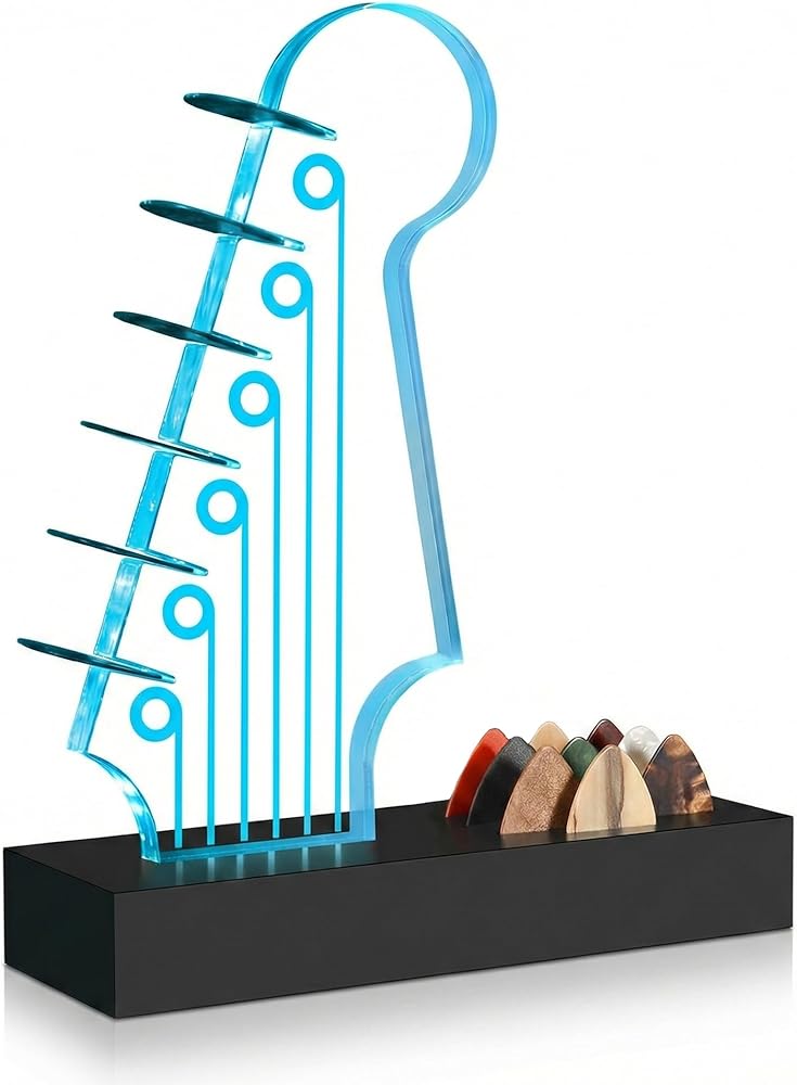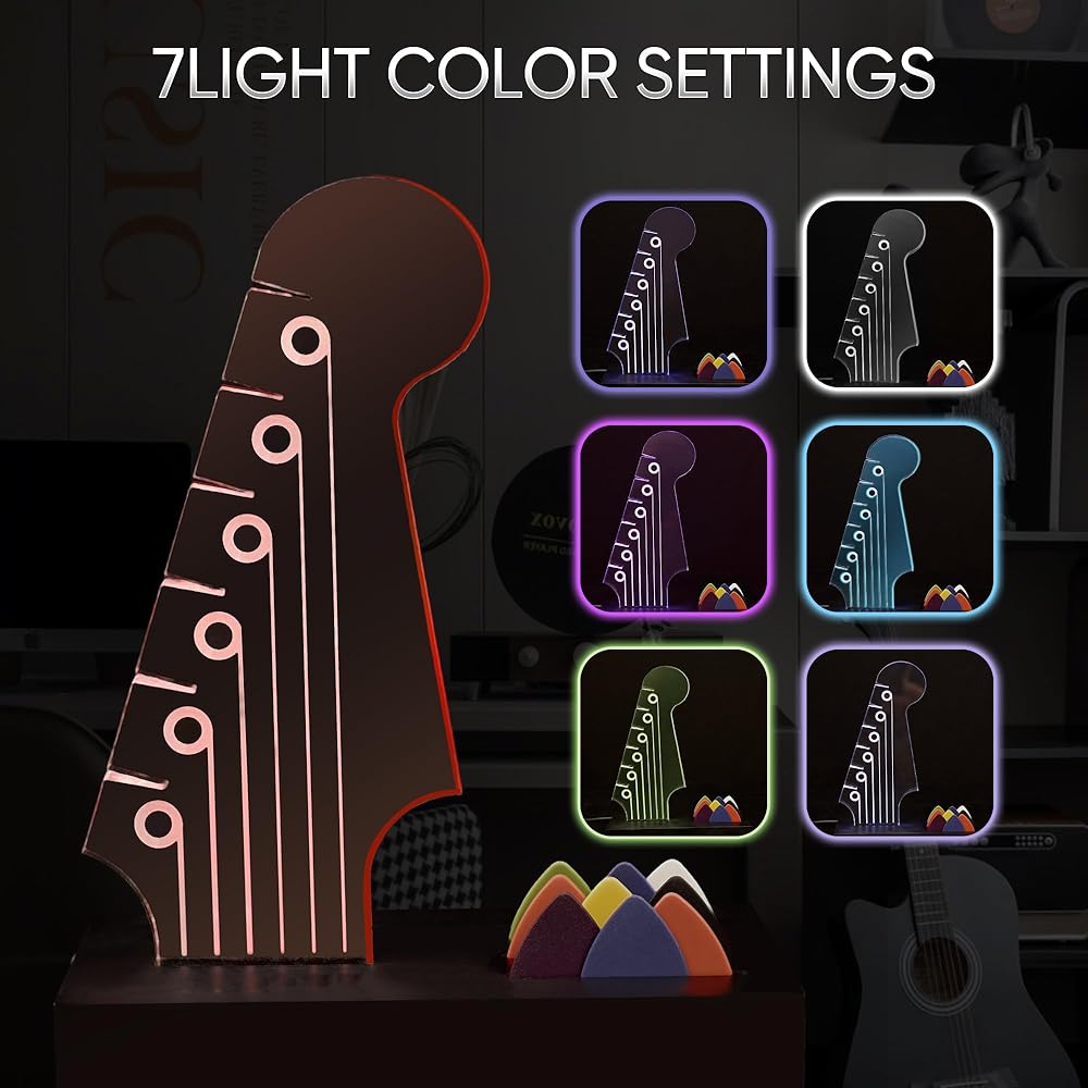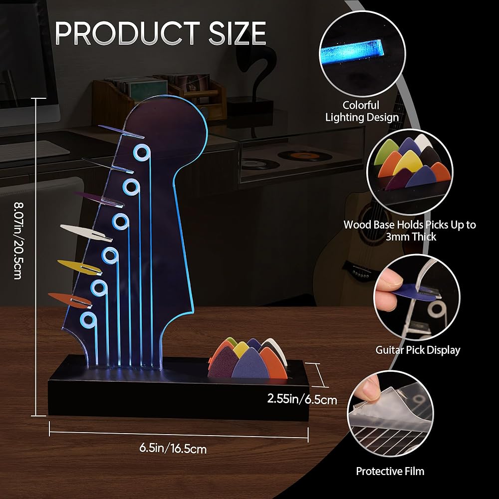 حامل اختيار الجيتار المضيء - تصميم رأس الجيتار الكهربائي، أضواء متغيرة 7 ألوان، هدايا الجيتار لمحبي الموسيقى، عرض اختيار الجيتار مع قاعدة خشبية، ملحقات جيتار رائعة وفريدة من نوعها